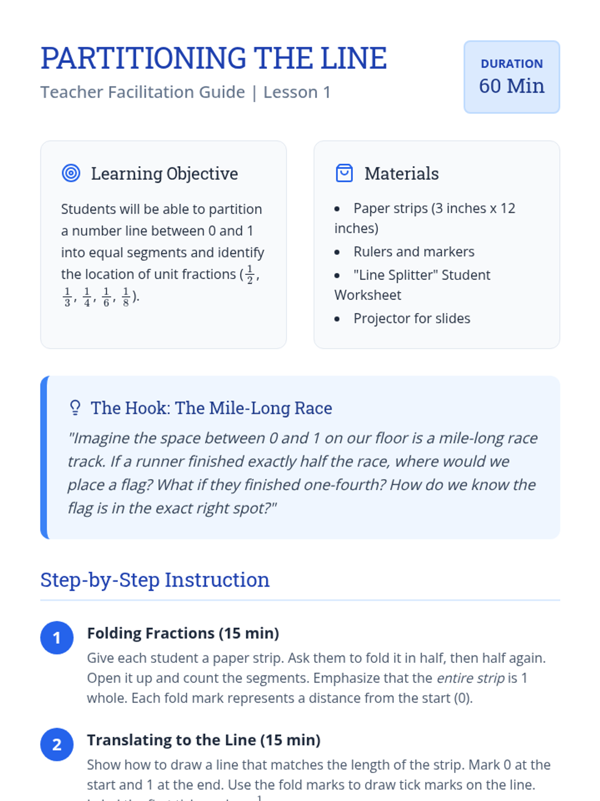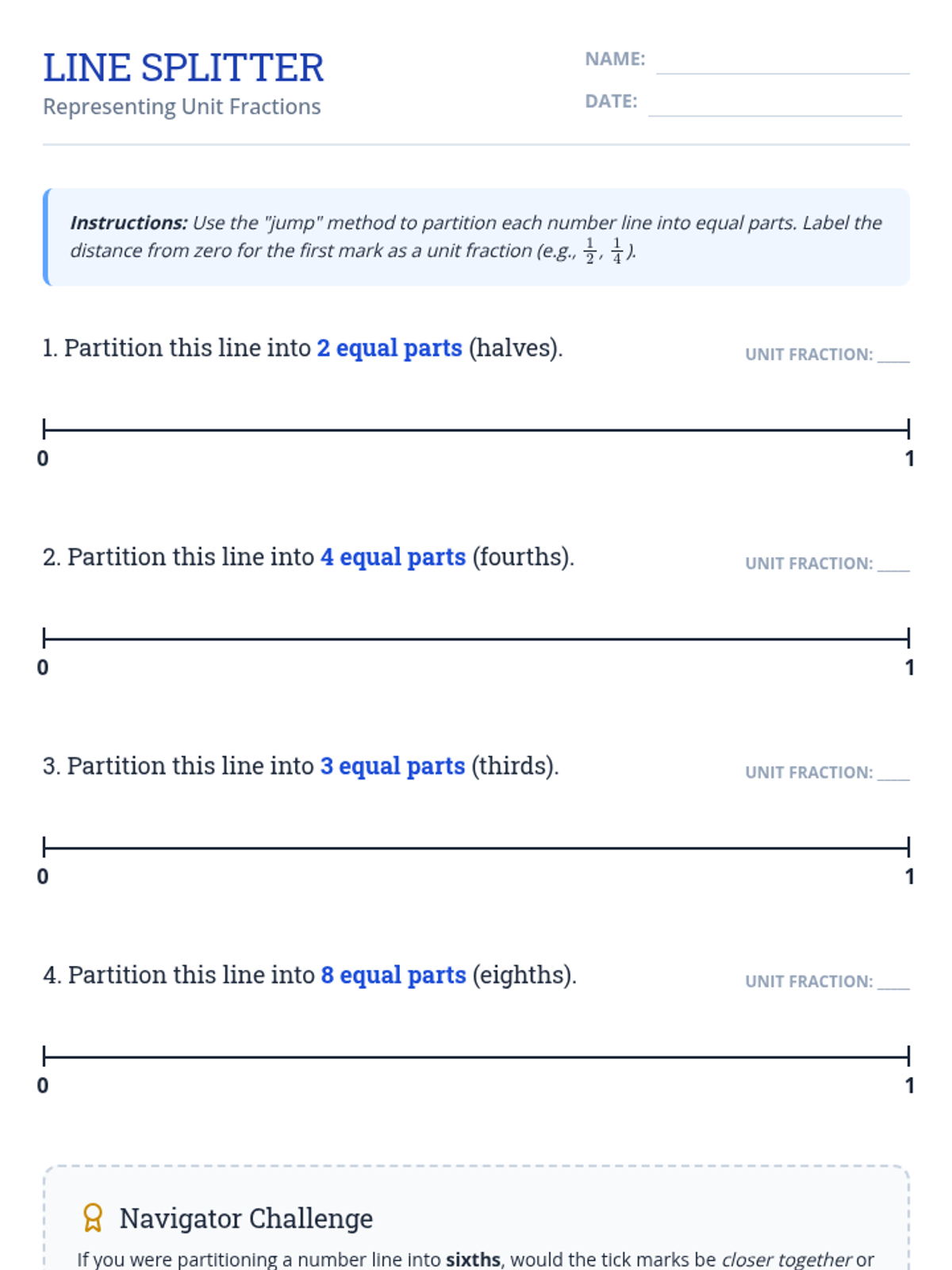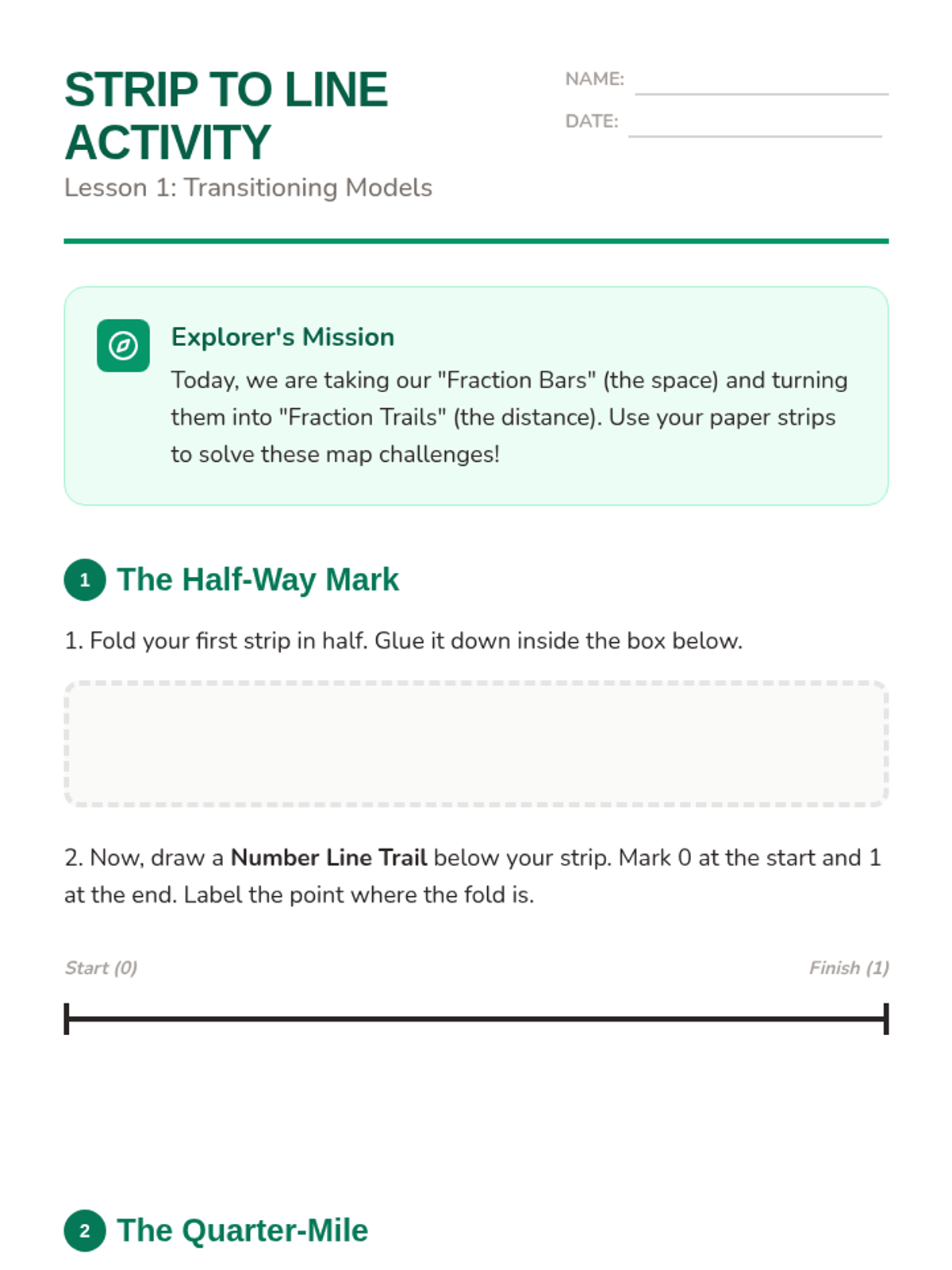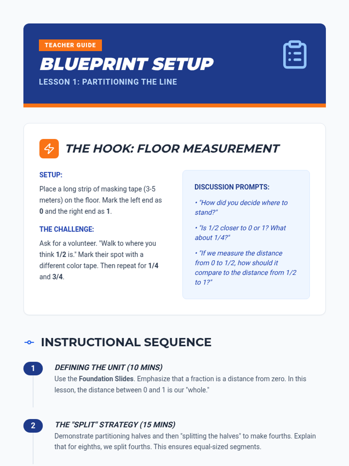 A comprehensive journey from area models to linear representations of fractions. Students explore the interval between whole numbers, partition number lines into equal segments, and locate fractions as distances from zero, extending their understanding to values greater than one.
