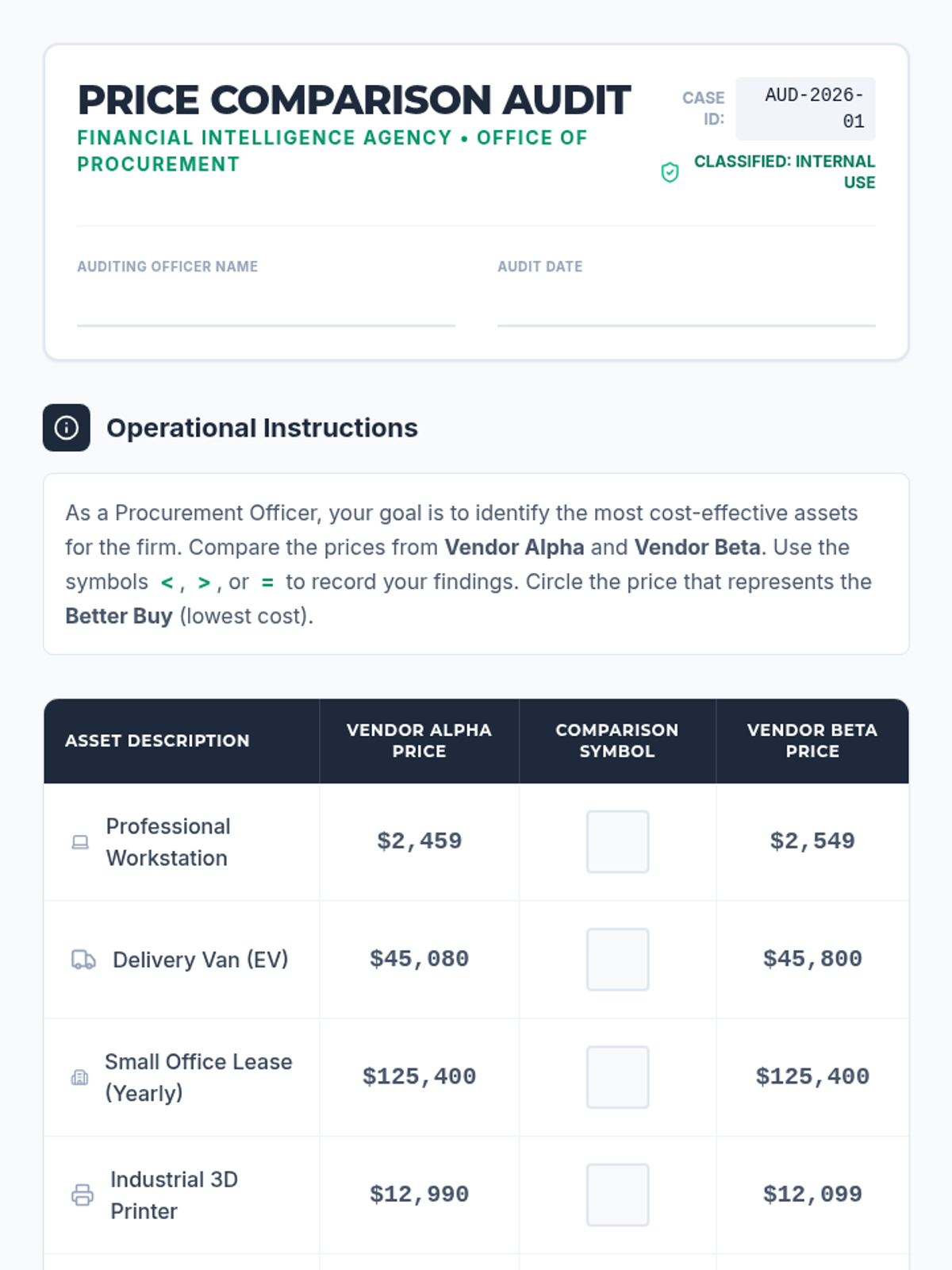 A math sequence for 4th graders focusing on comparing and ordering numbers through the lens of financial literacy and procurement. Students act as financial officers, making decisions based on price audits, budgets, and sales data.