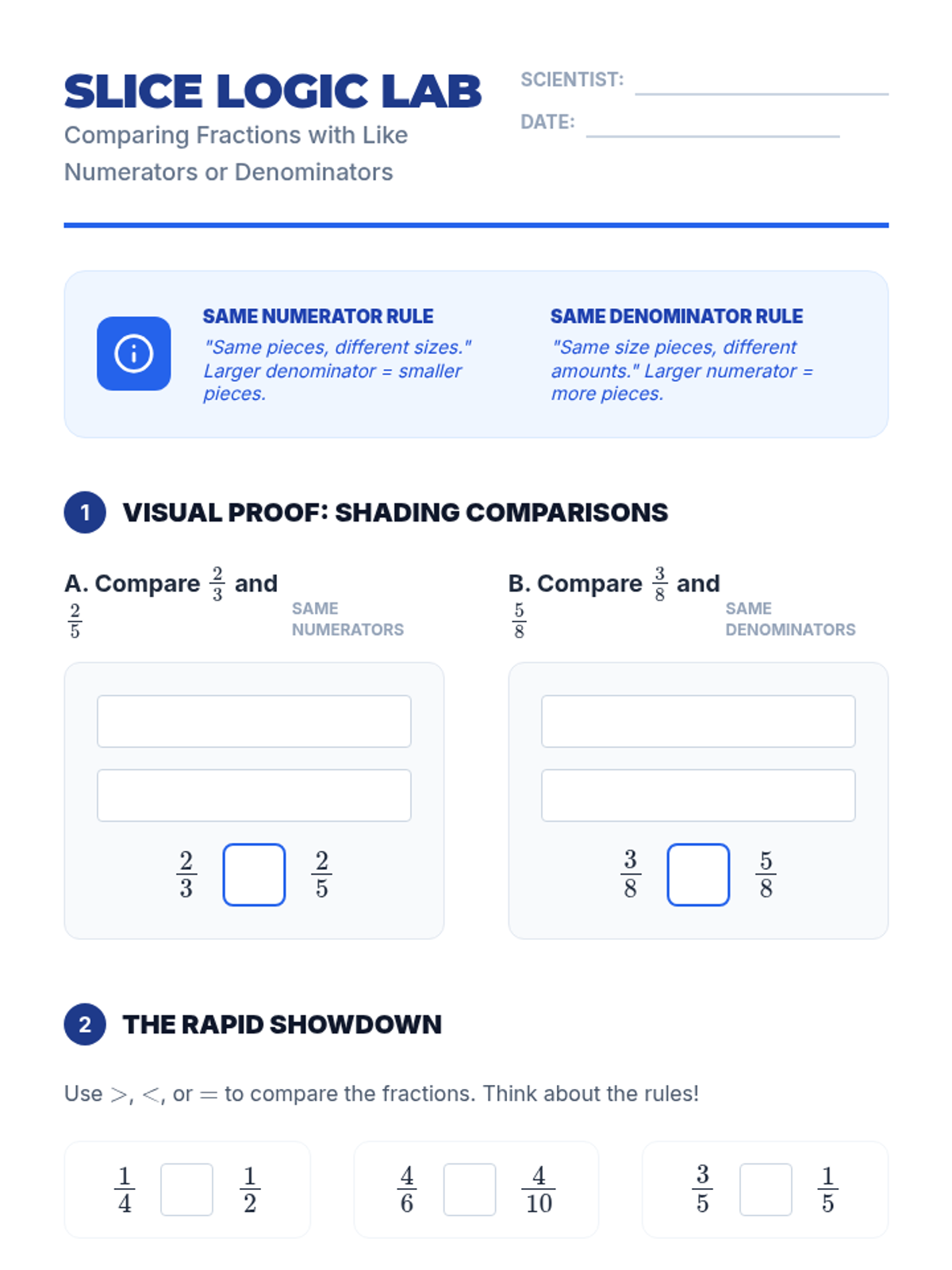 A comprehensive sequence for 4th graders to master comparing and ordering rational numbers (fractions and decimals). Students move from basic reasoning about fraction sizes to complex ordering of mixed formats using logic-based strategies and kinetic activities.