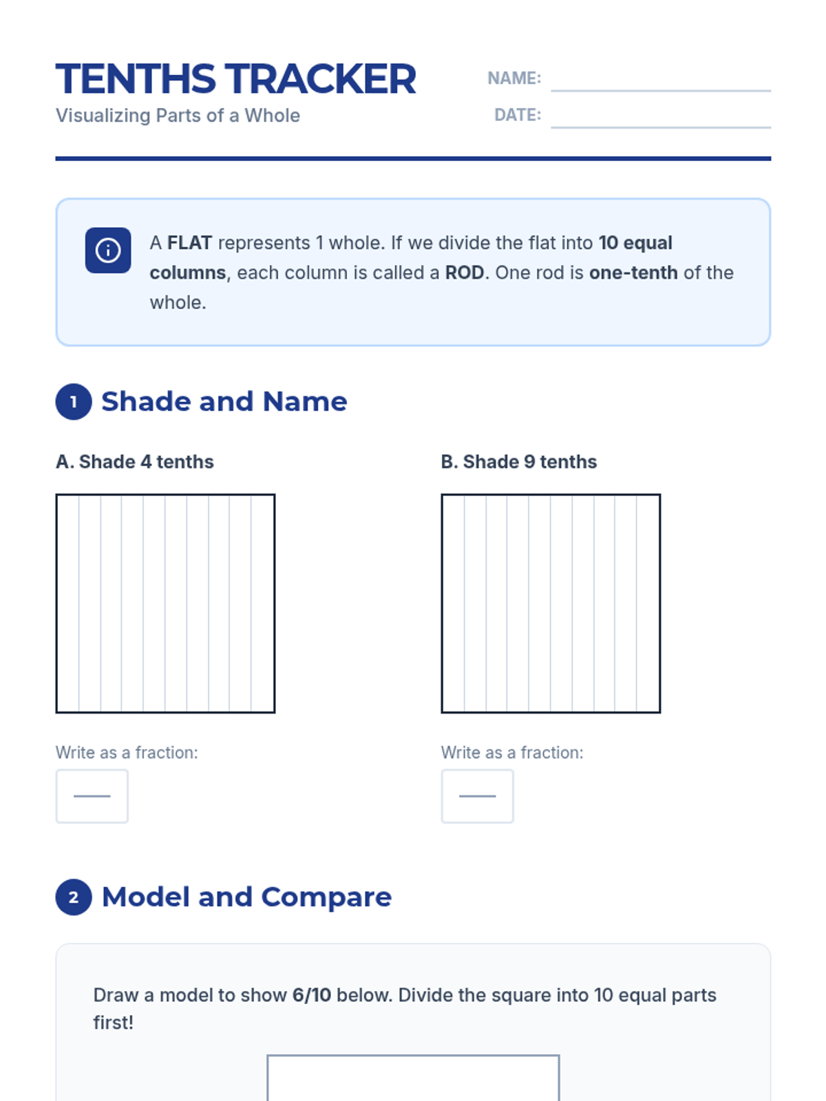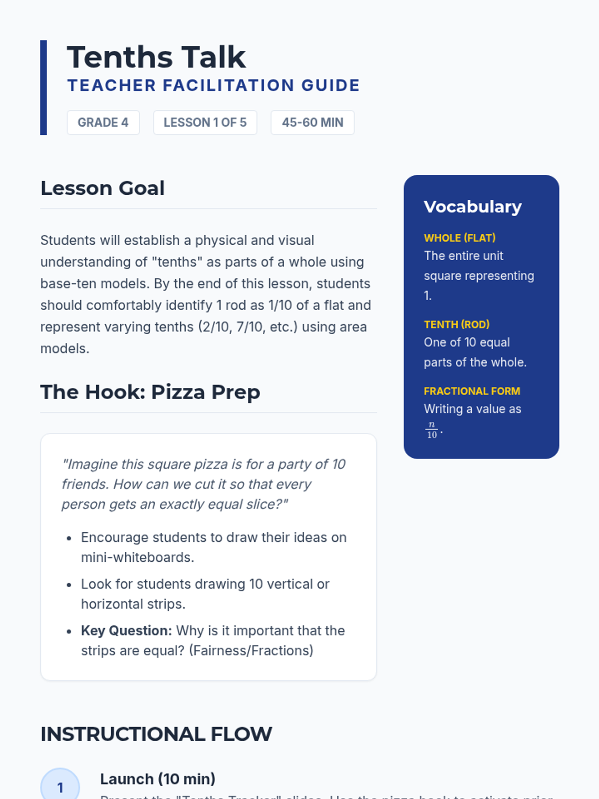 This sequence builds a conceptual foundation for decimals by linking them to fractions and area models. Students progress from physical base-ten models to writing tenth and hundredth notation, culminating in a mosaic design project.