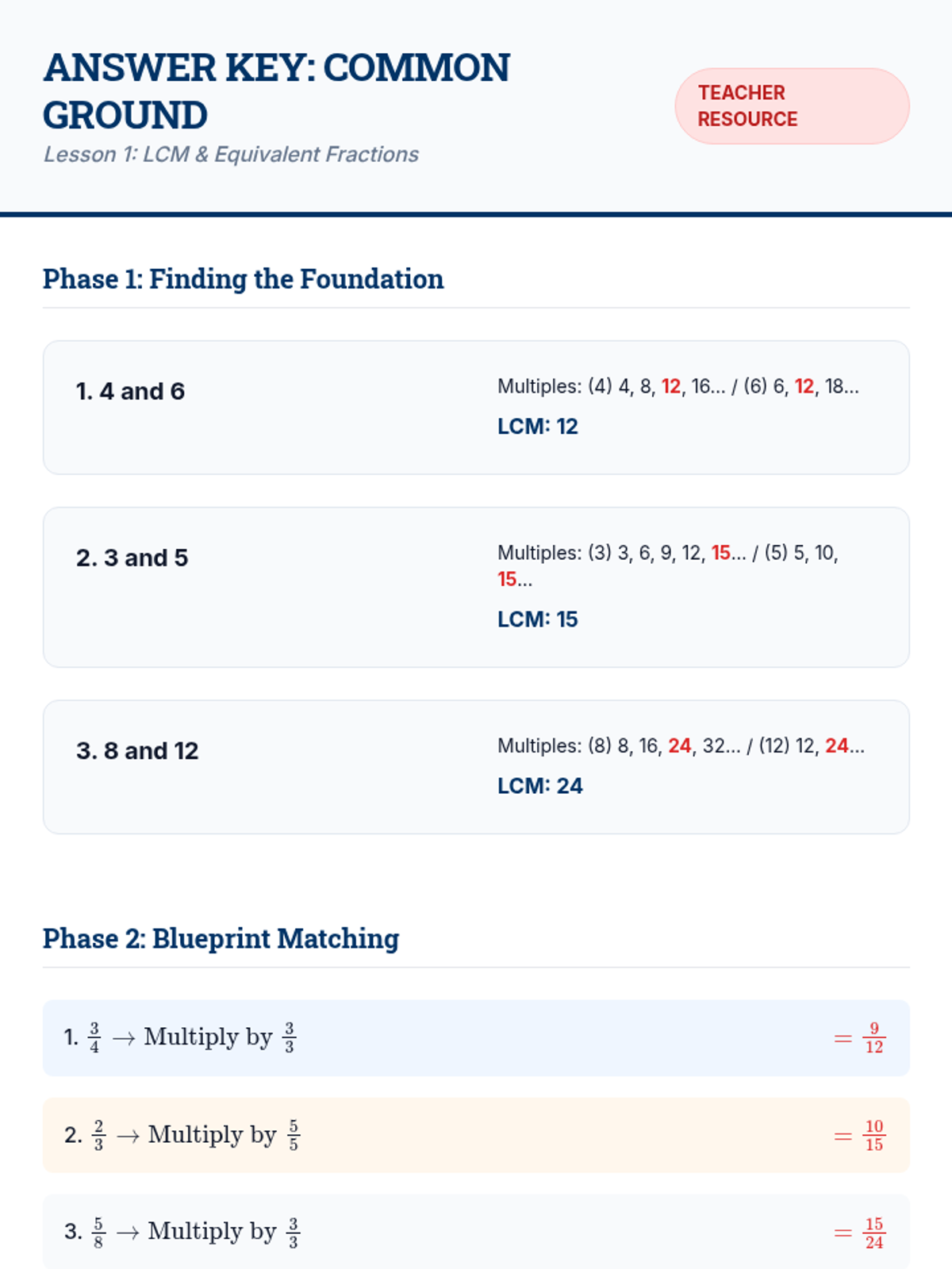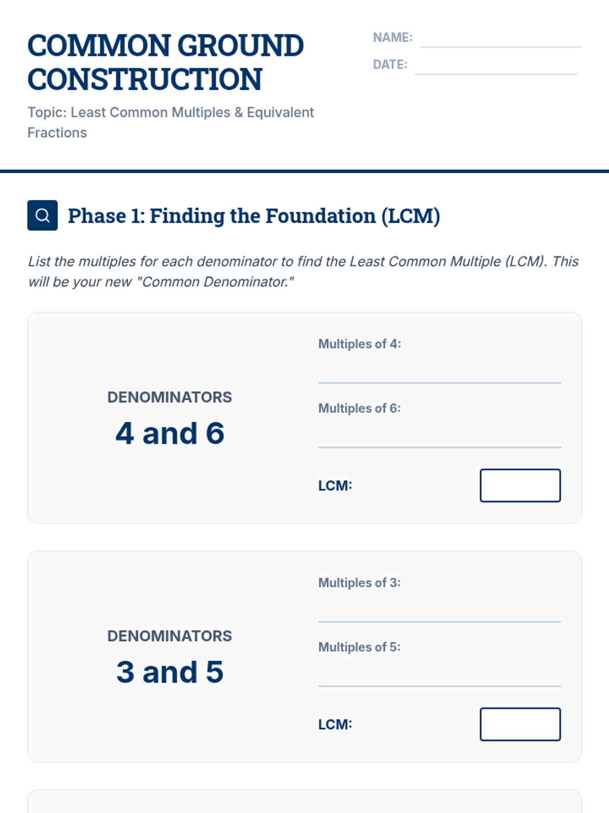 This inquiry-based sequence teaches 4th-grade students to add and subtract fractions with unlike denominators by finding the Least Common Multiple (LCM), creating equivalent fractions, and simplifying results. Students use visual models and real-world scenarios, like carpentry and cooking, to master these complex operations.