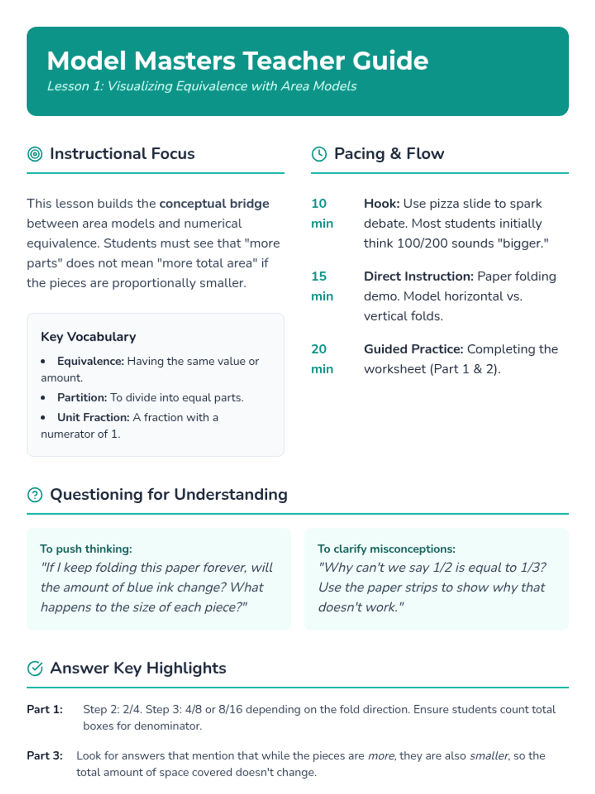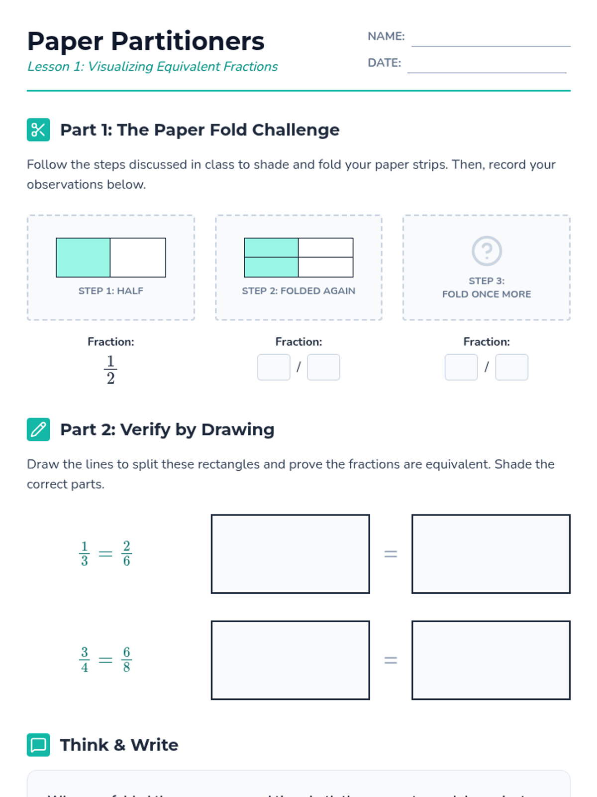 A comprehensive 4th Grade unit on equivalent fractions, moving from visual area models and number lines to the procedural identity property and simplification. Students will learn to generate, identify, and justify equivalent fractions through inquiry-based activities and real-world scenarios.