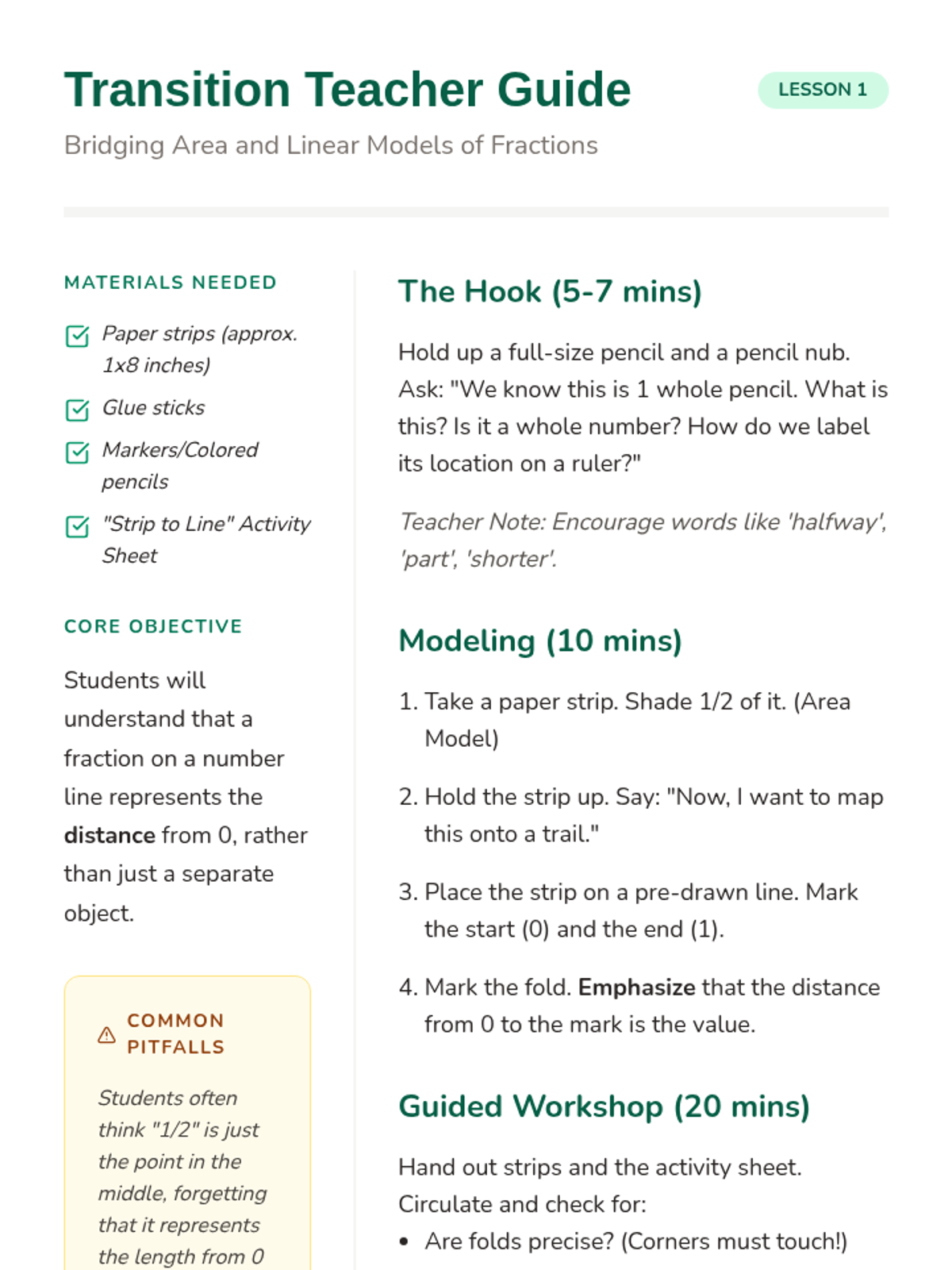 A comprehensive 7-lesson intervention sequence designed to build conceptual fraction understanding through visual models, number lines, and scaffolded practice. The sequence moves from basic area models to adding and subtracting with unlike denominators, prioritizing 'why' over 'how'.