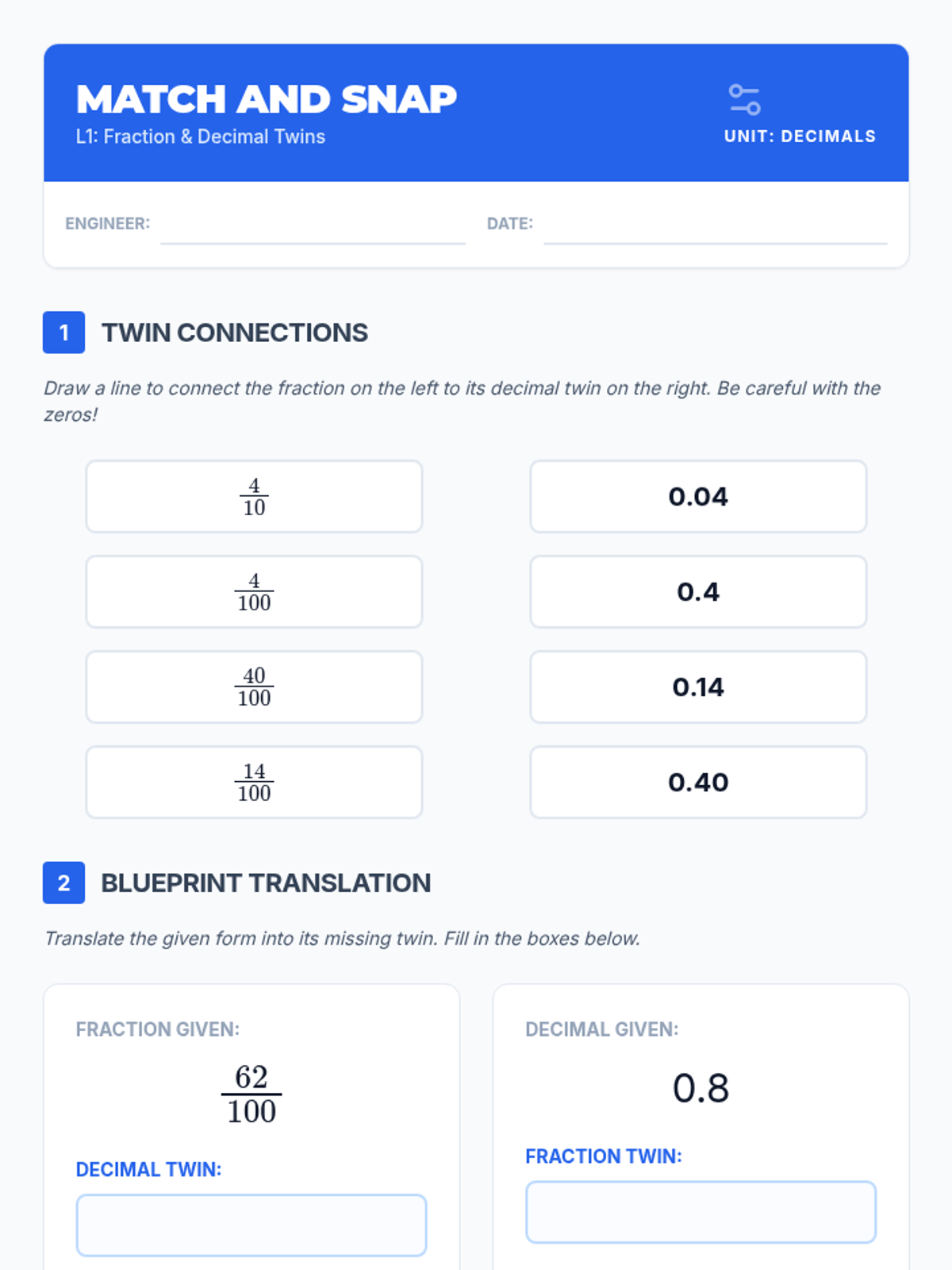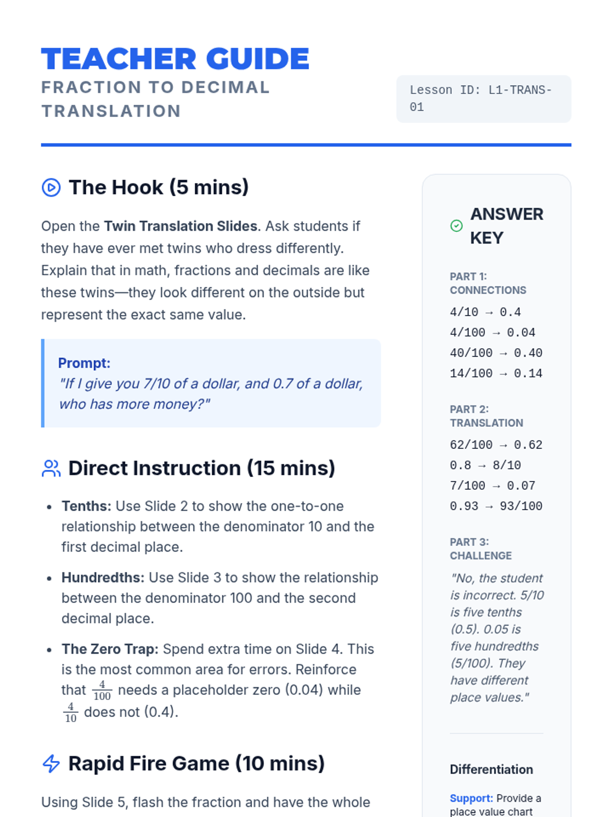This workshop-style sequence empowers students to fluently translate between fraction and decimal notations to compare values effectively. Students explore fractions as division, use powers of ten for conversion, and master ordering mixed data sets.