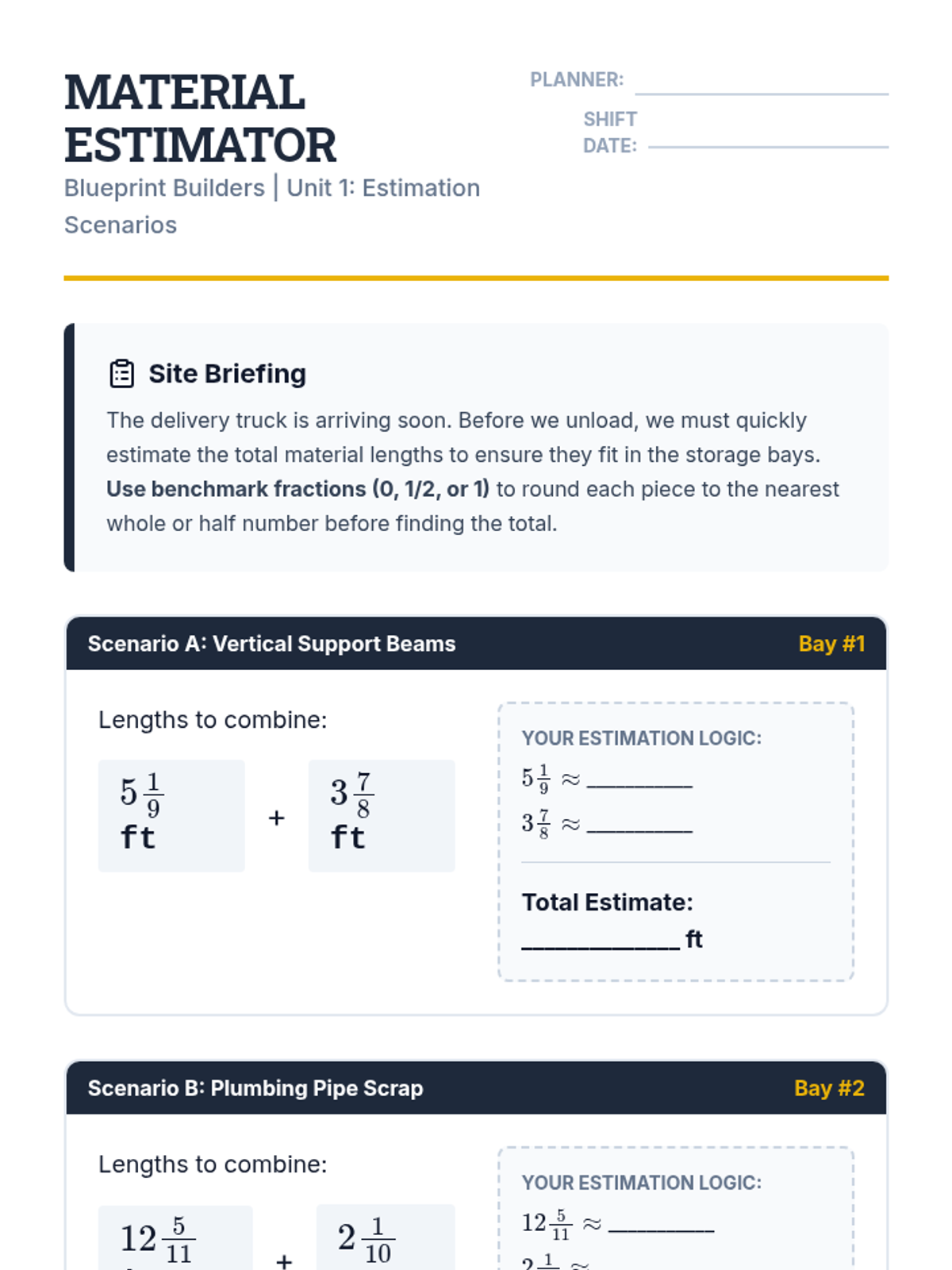 Students act as Construction Planners, applying fraction addition and subtraction to solve real-world measurement and design problems. The sequence progresses from estimation with benchmarks to precise calculations with unlike denominators and error analysis.