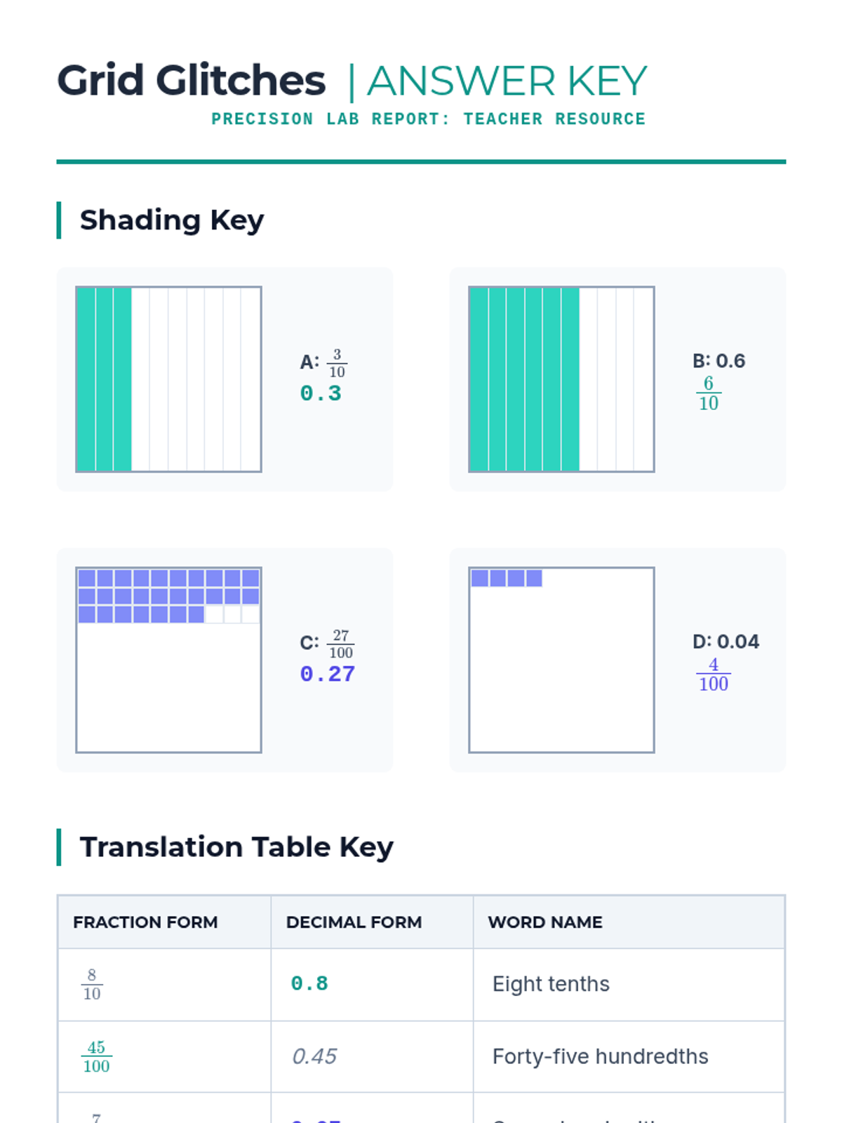 This sequence introduces 4th-grade students to decimals through the lens of tenths and hundredths. Students will progress from visual models on grids to comparing values, performing addition and subtraction, and finally applying these skills to real-world metric measurements.