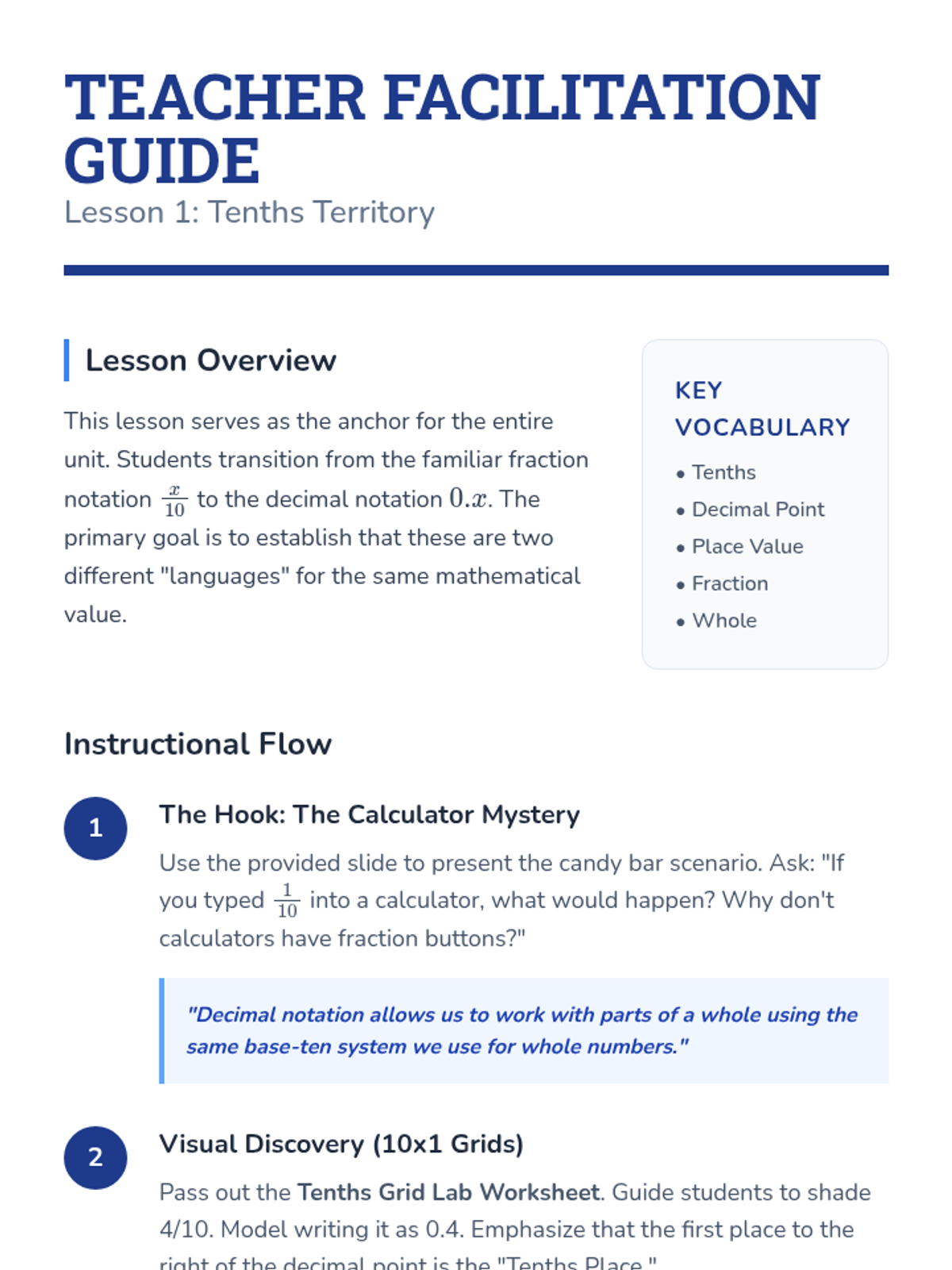 This sequence guides 4th-grade students through the transition from fractions to decimals, focusing on tenths and hundredths as extensions of the base-ten system using visual grids, number lines, and money models.