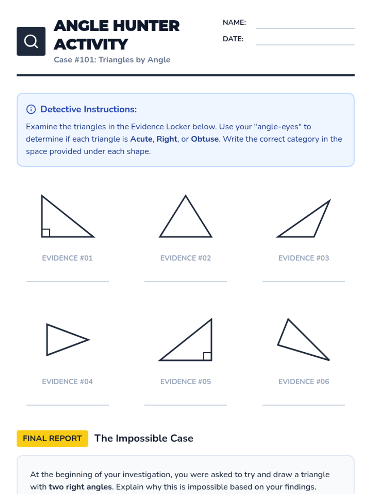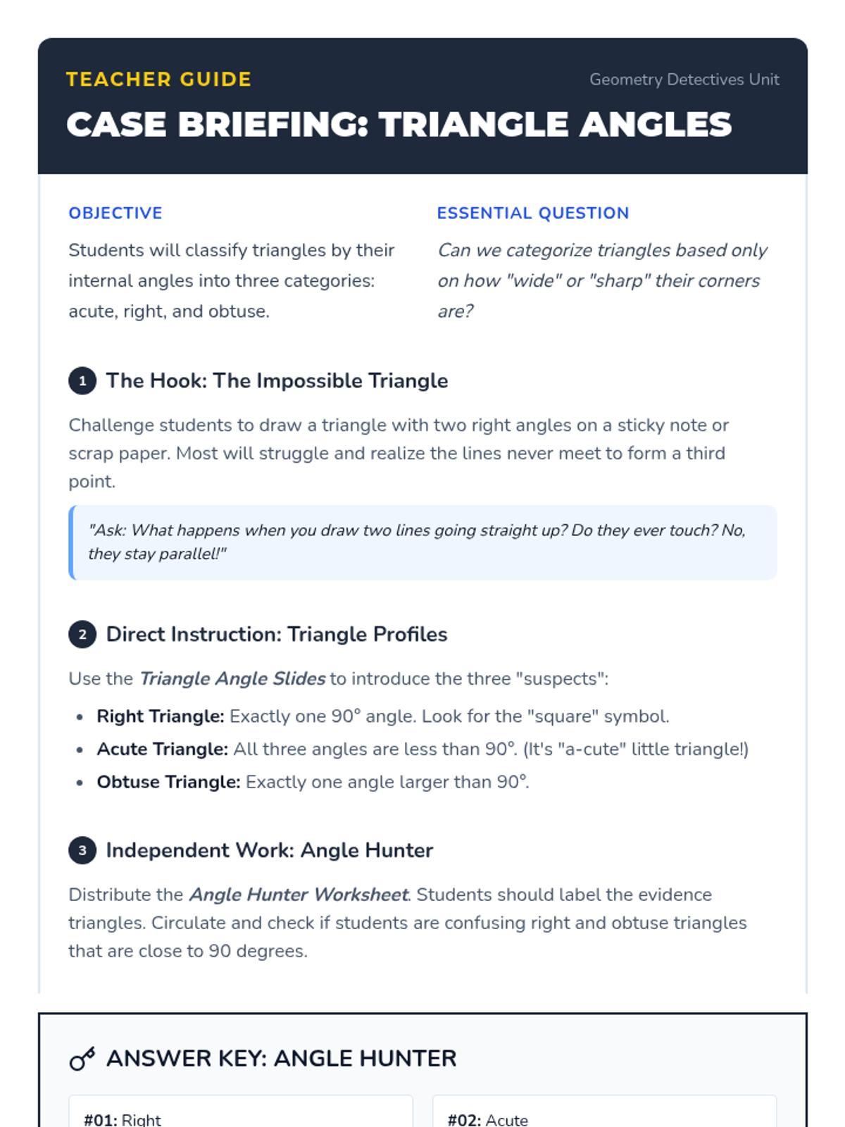 A 4th-grade geometry unit focused on classifying triangles and quadrilaterals by their properties (sides and angles). Students act as 'Geometry Detectives' to solve shape mysteries and understand hierarchical relationships.