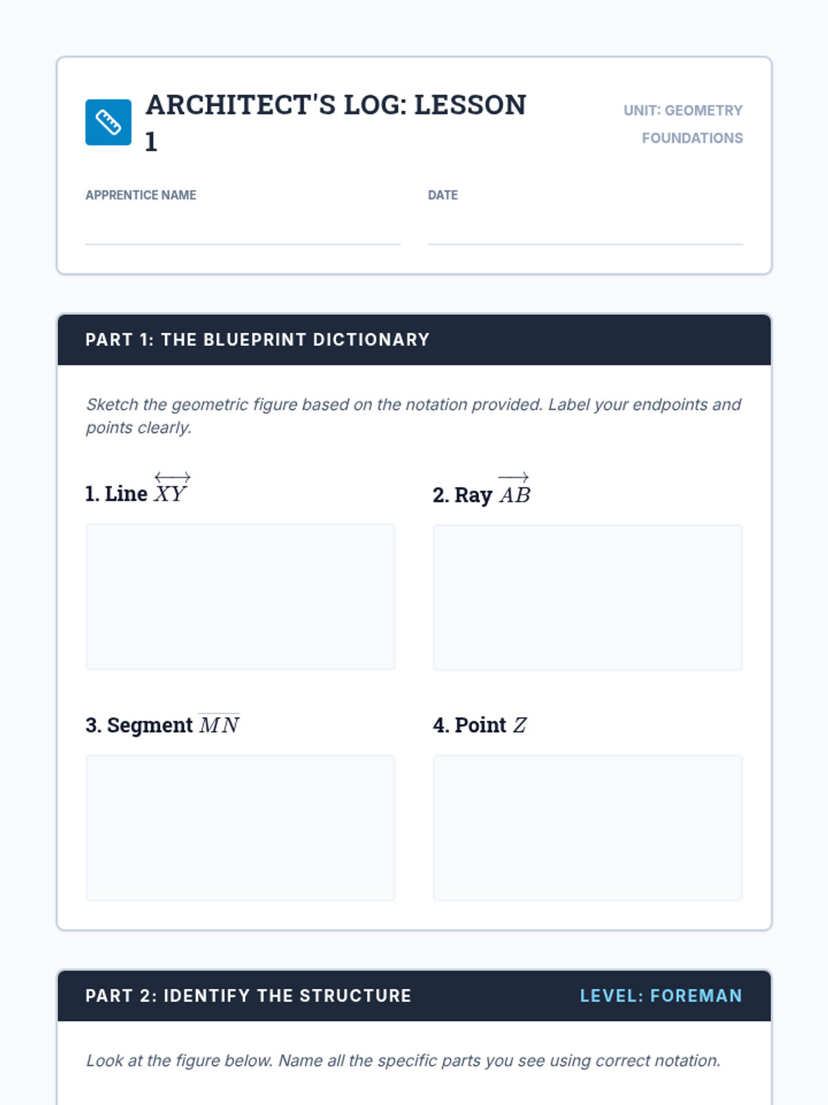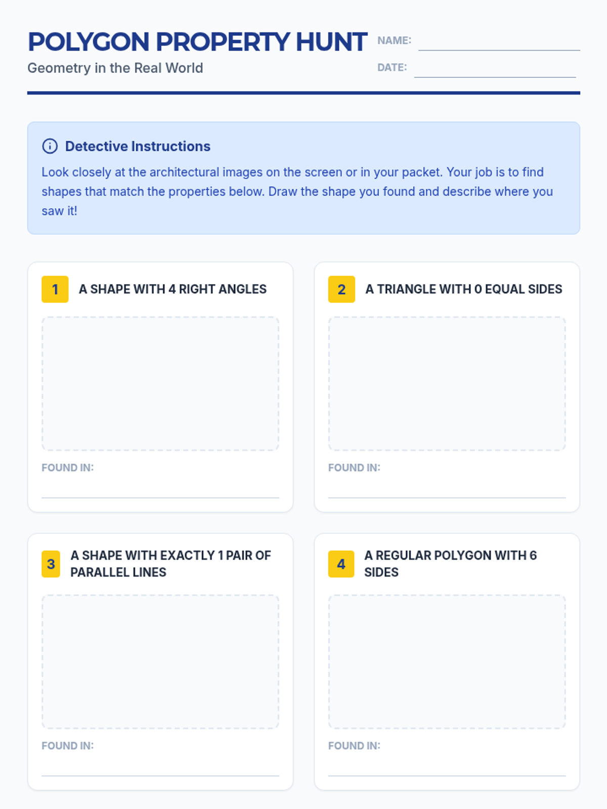 A two-week enrichment project where students act as architects to research, design, and calculate the geometry of a modern structure. The project covers points, lines, angles, and 2D shape classification through real-world application and creative design.