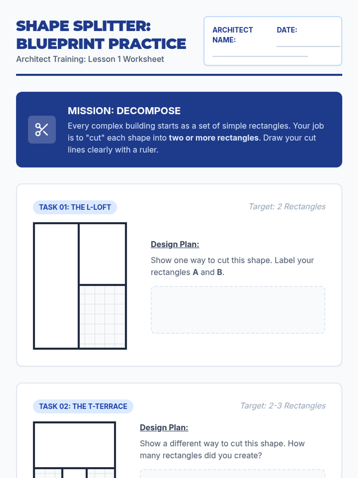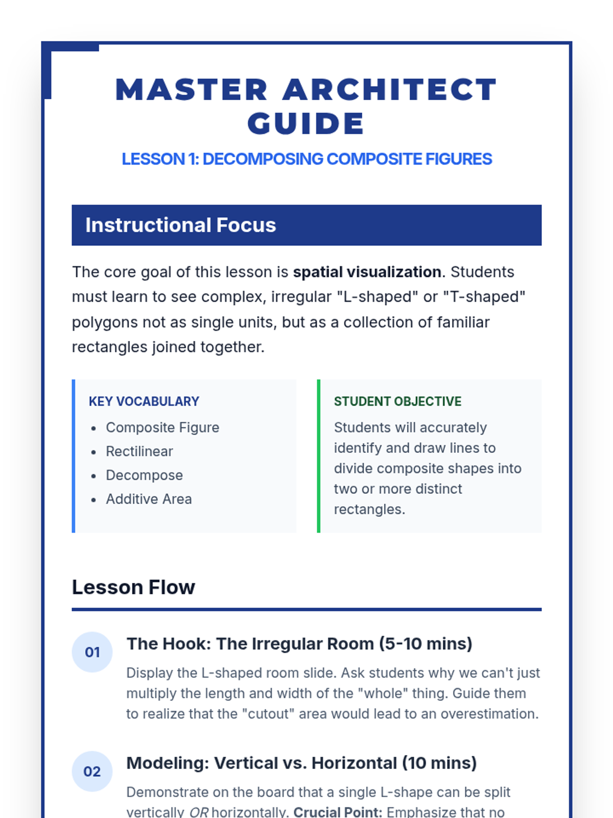 A four-day intensive unit on decomposing rectilinear figures to find total area, progressing from basic strategies to complex real-world architectural challenges. Students act as 'Blueprint Builders' to master vertical cuts, horizontal cuts, and additive/subtractive methods.