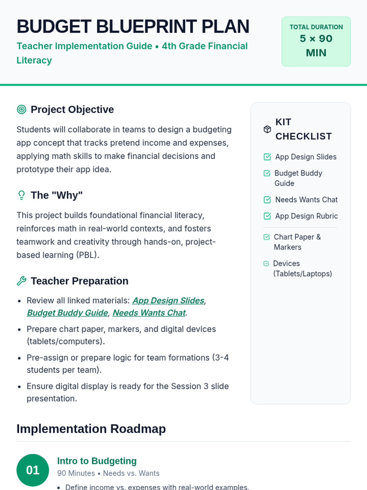 A comprehensive 5-session project-based learning unit where 4th-grade students collaborate to design a budgeting app, applying math and financial literacy to solve real-world problems.