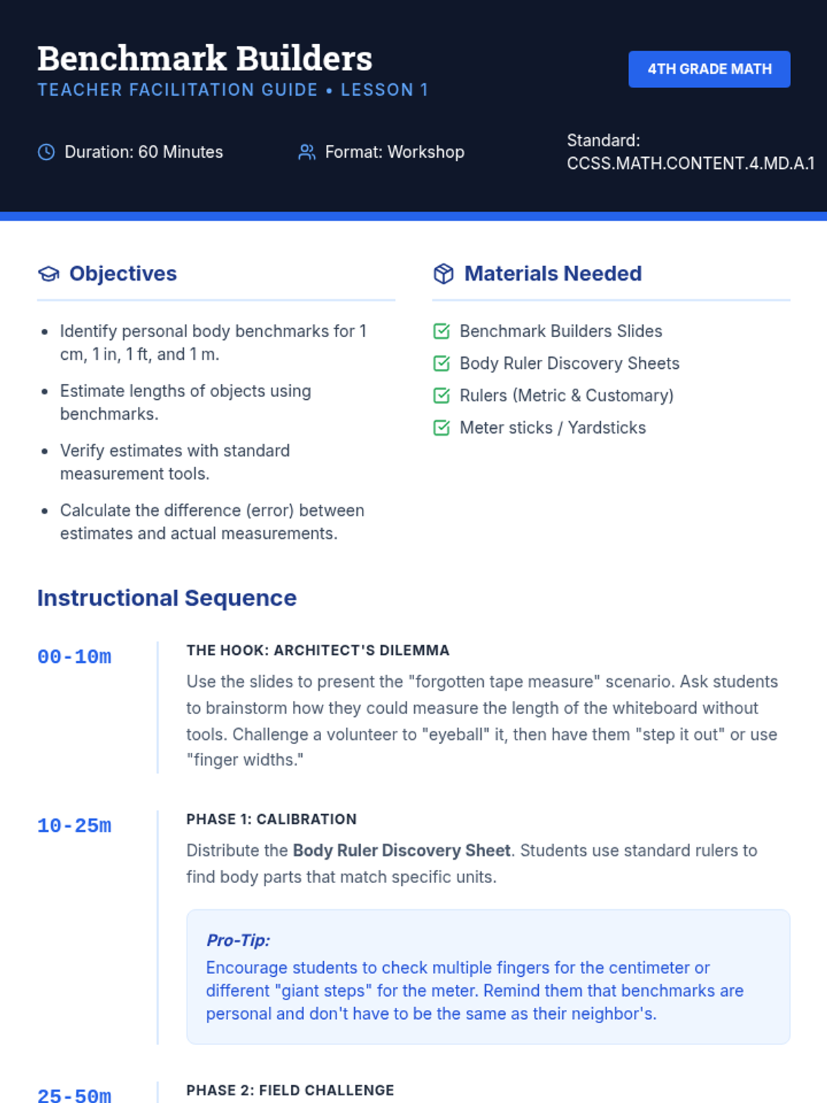 A 4th-grade math unit focused on developing mental benchmarks for length, selecting appropriate tools for measurement, and mastering estimation through hands-on workshops and games.