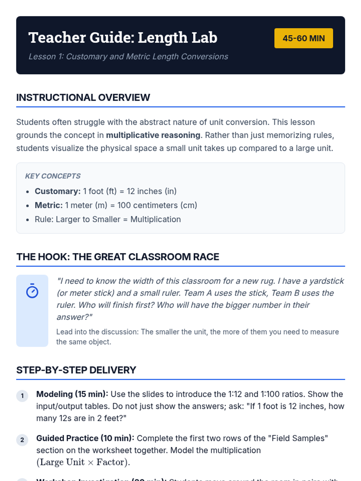 A comprehensive 4th-grade mathematics unit focused on converting larger units of measurement to smaller ones using multiplicative comparison. Students explore length, weight, mass, liquid volume, and time through interactive workshops, games, and real-world problem-solving.