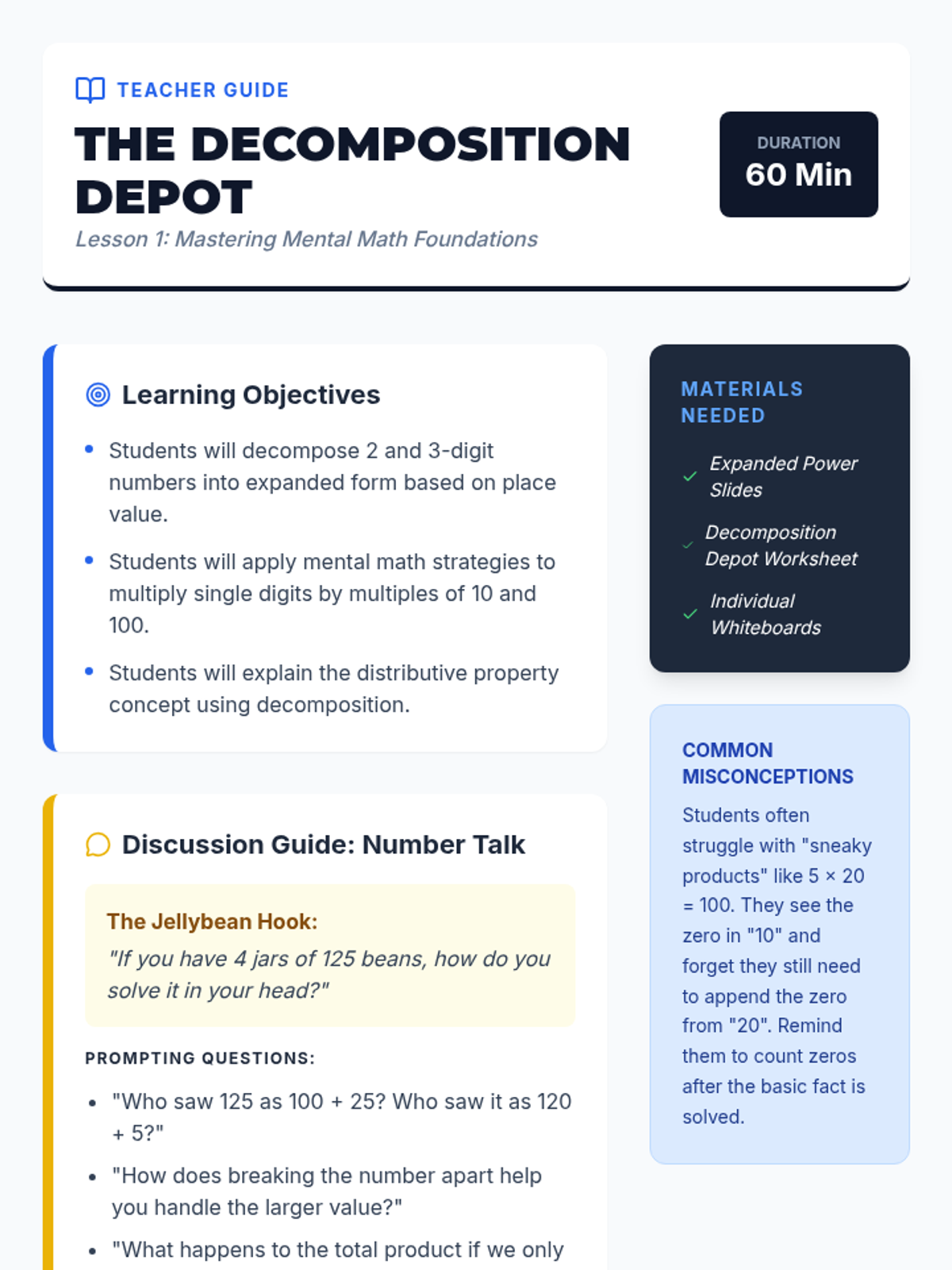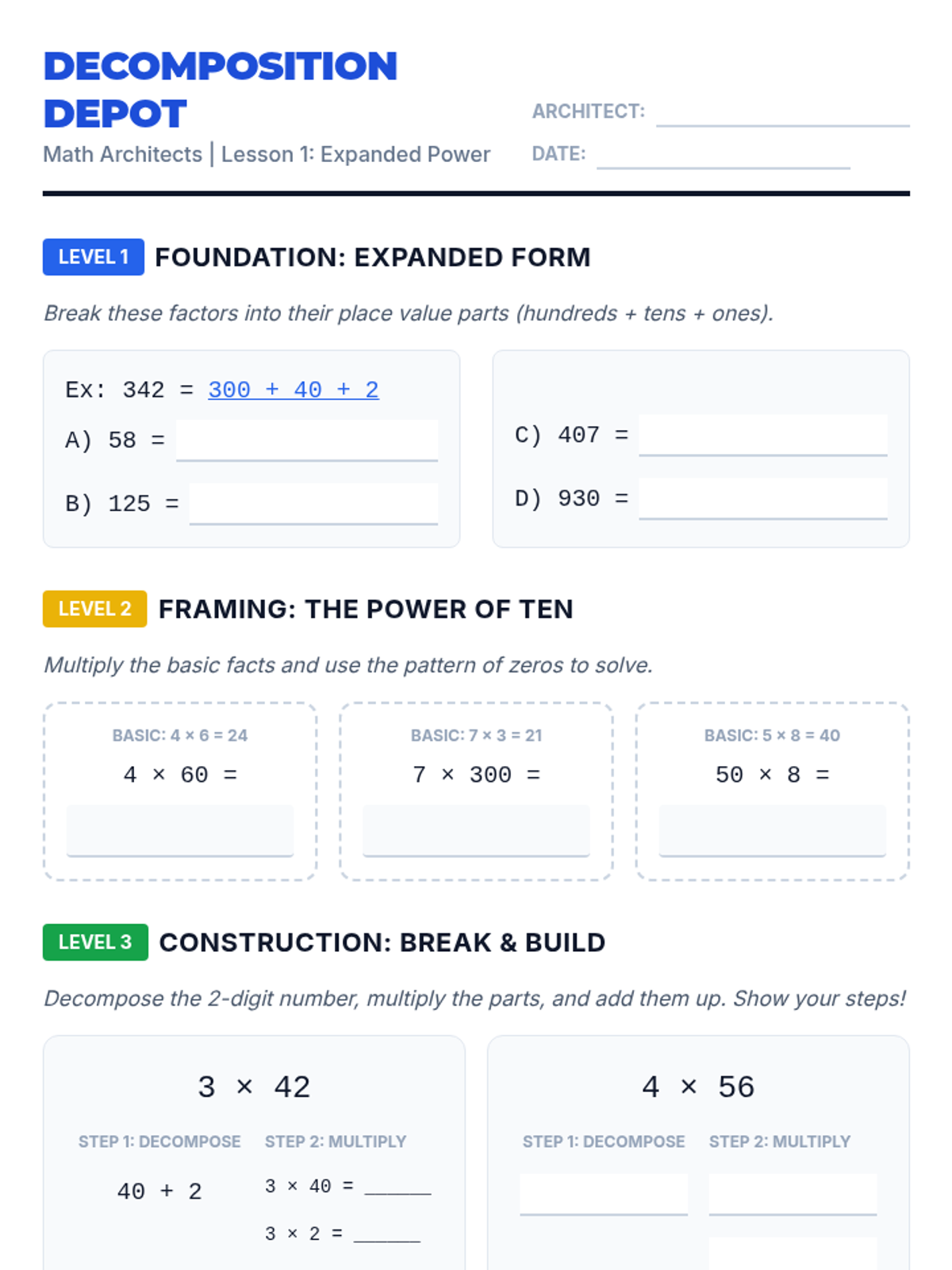 A comprehensive 4th-grade math sequence that transitions students from concrete base-ten block arrays to abstract partial product multiplication using the area model (box method). Students act as 'Math Architects' to decompose numbers, visualize area, and solve real-world construction-themed problems.