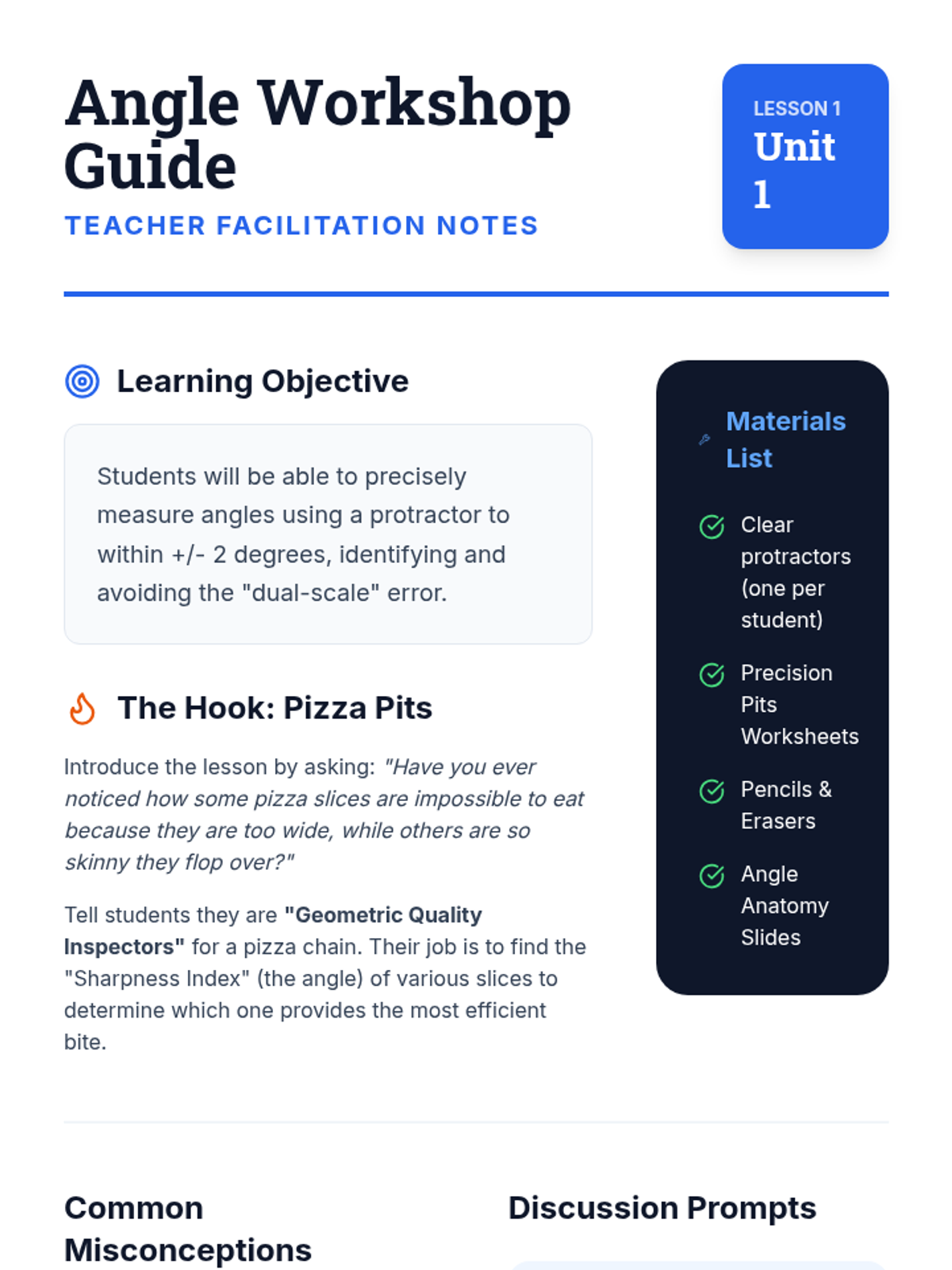 This workshop-style sequence transitions students from visual estimation to precise measurement using a protractor. Students learn the logic behind the 360-degree circle and how to align a protractor correctly to read measurements.