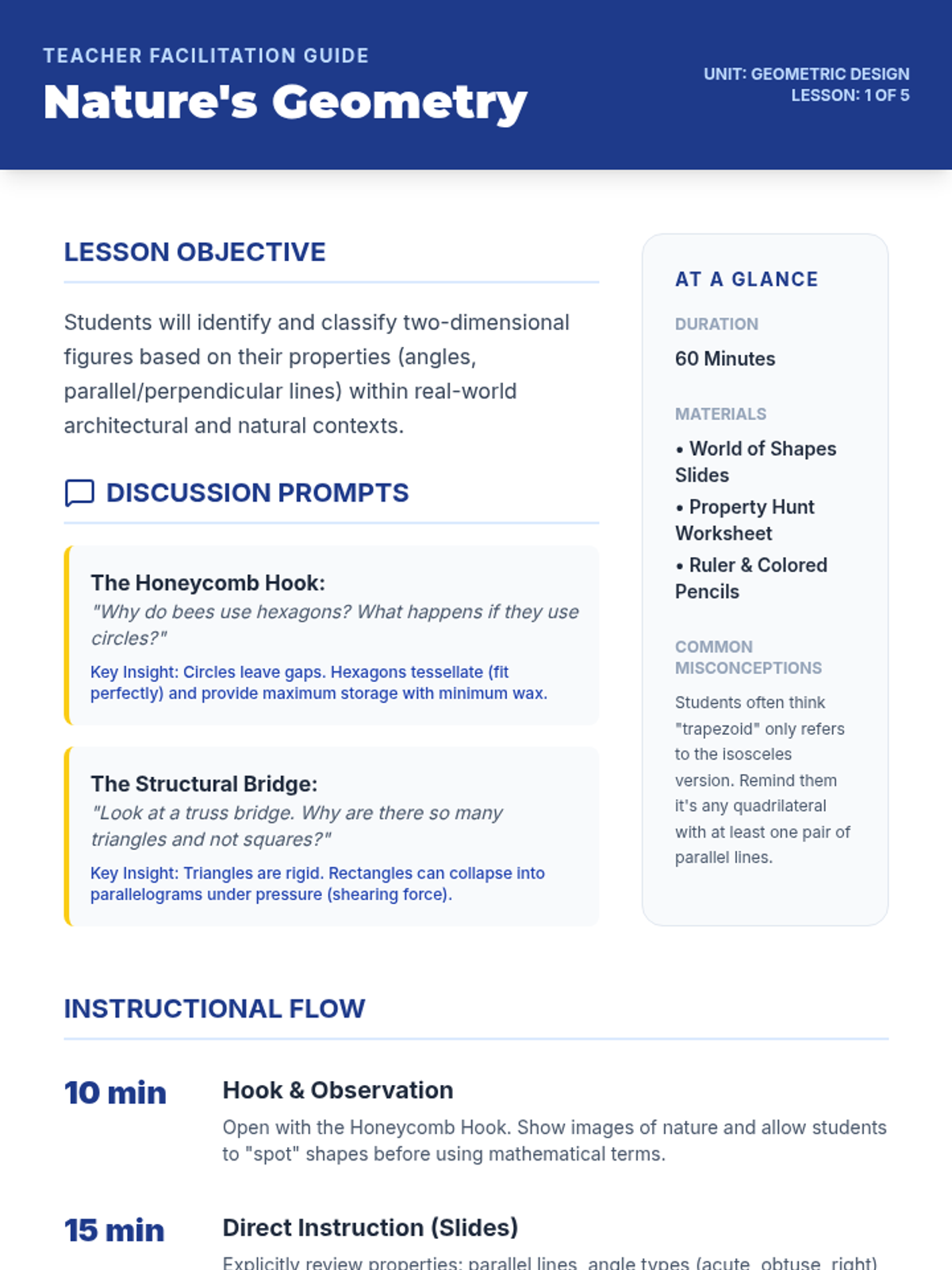 A project-based unit where 4th-grade students explore geometric classification through art and architecture, culminating in the creation of a 'Mathematical Mosaic' with a detailed geometric legend.
