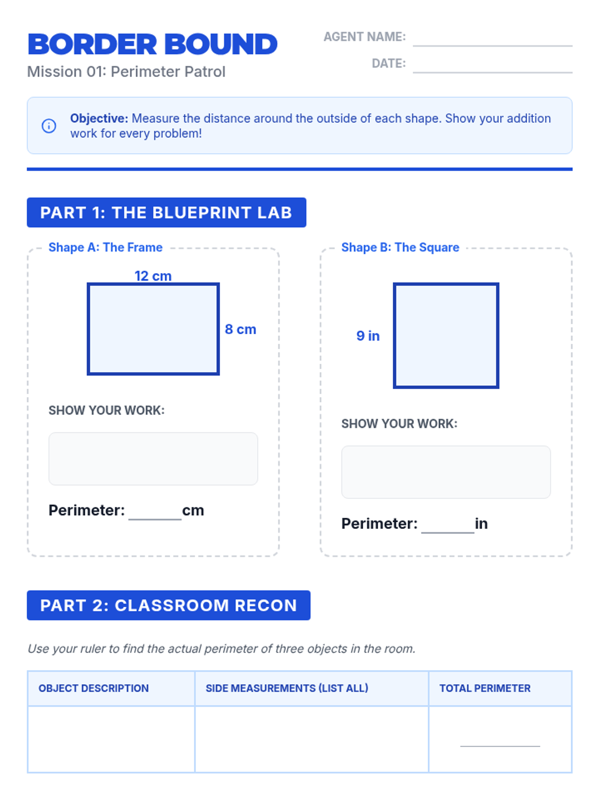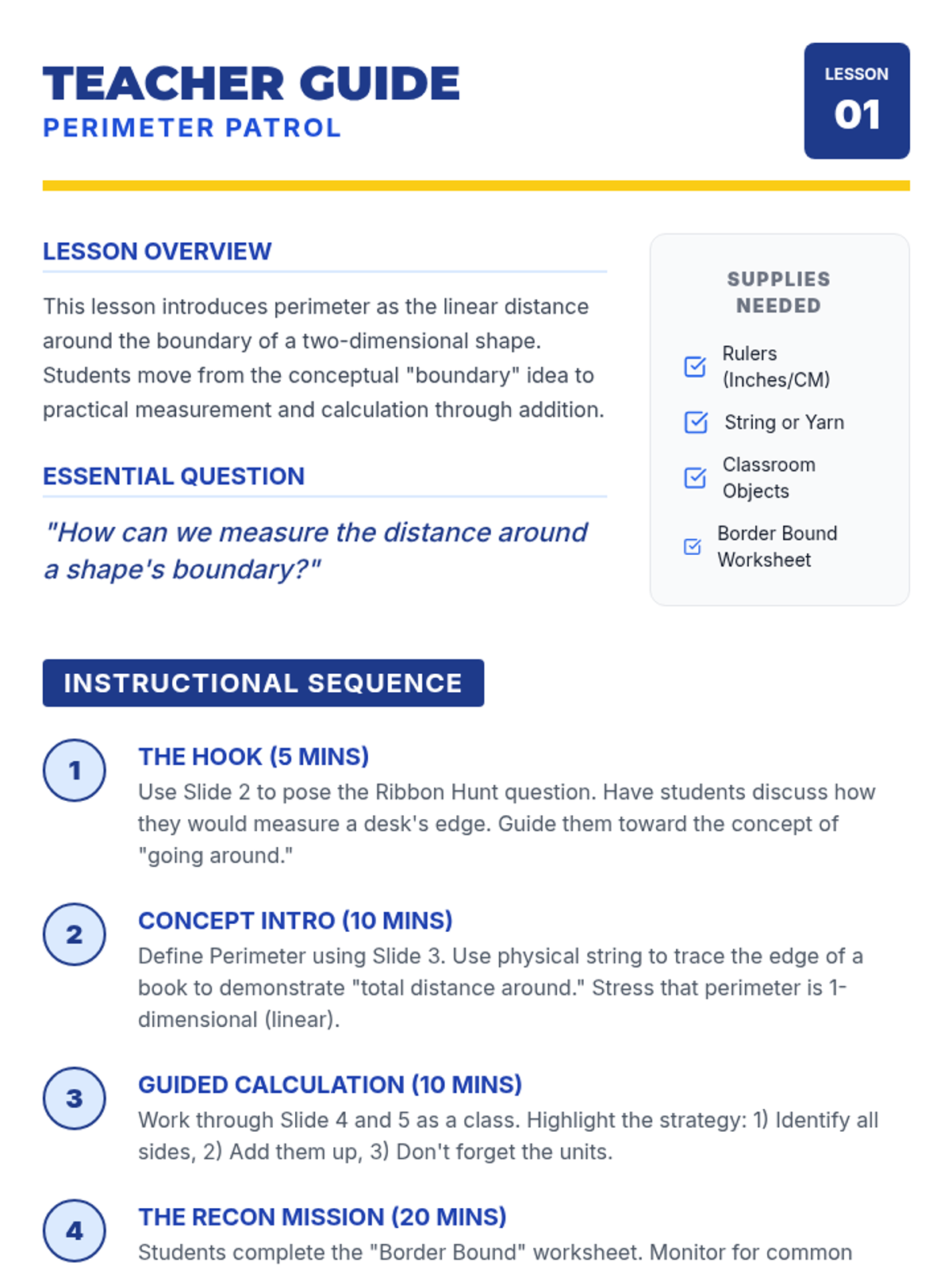 A foundational sequence for 4th graders to distinguish between linear distance (perimeter) and 2D space (area) through hands-on exploration, grid modeling, and standard unit application.