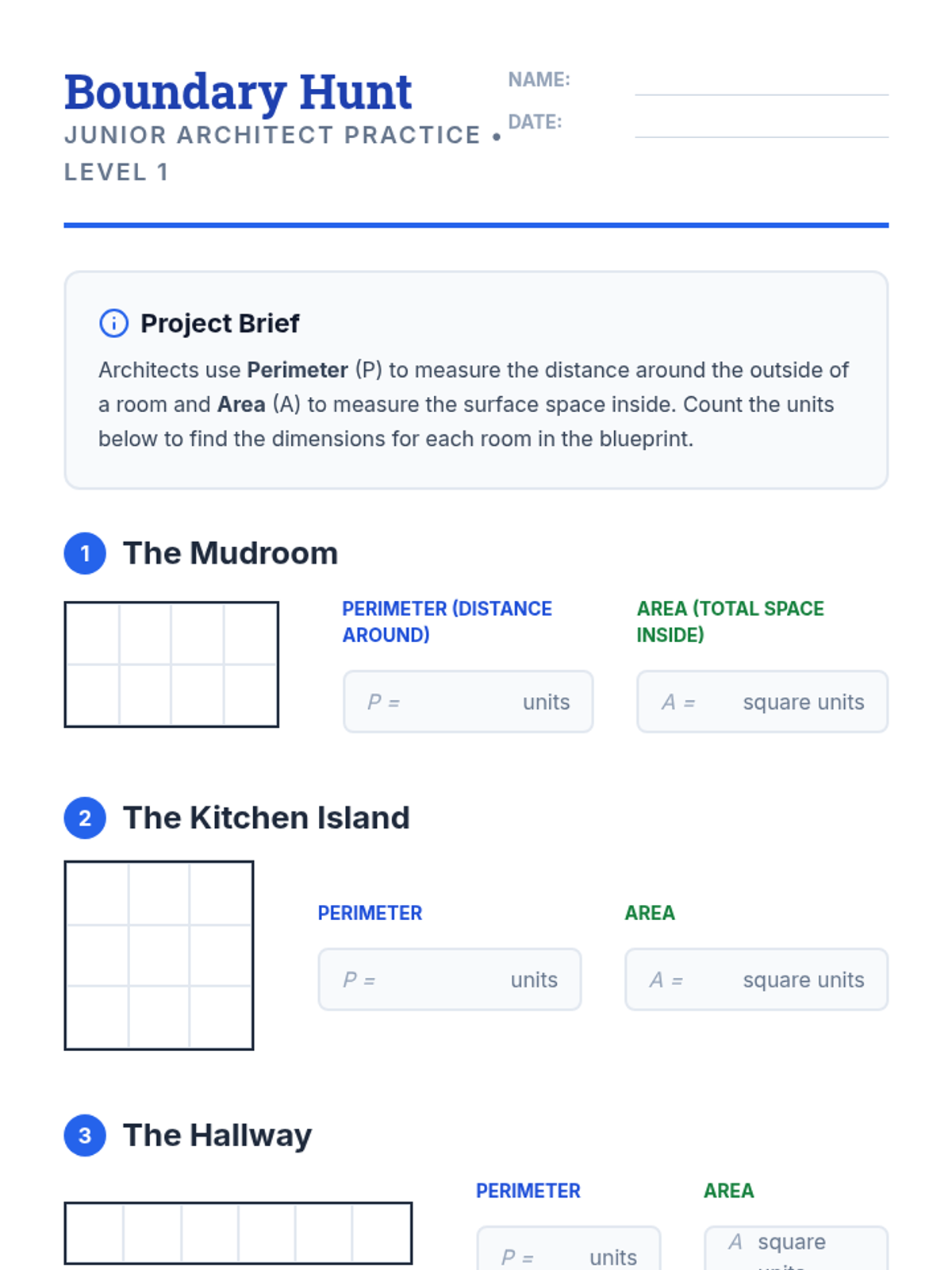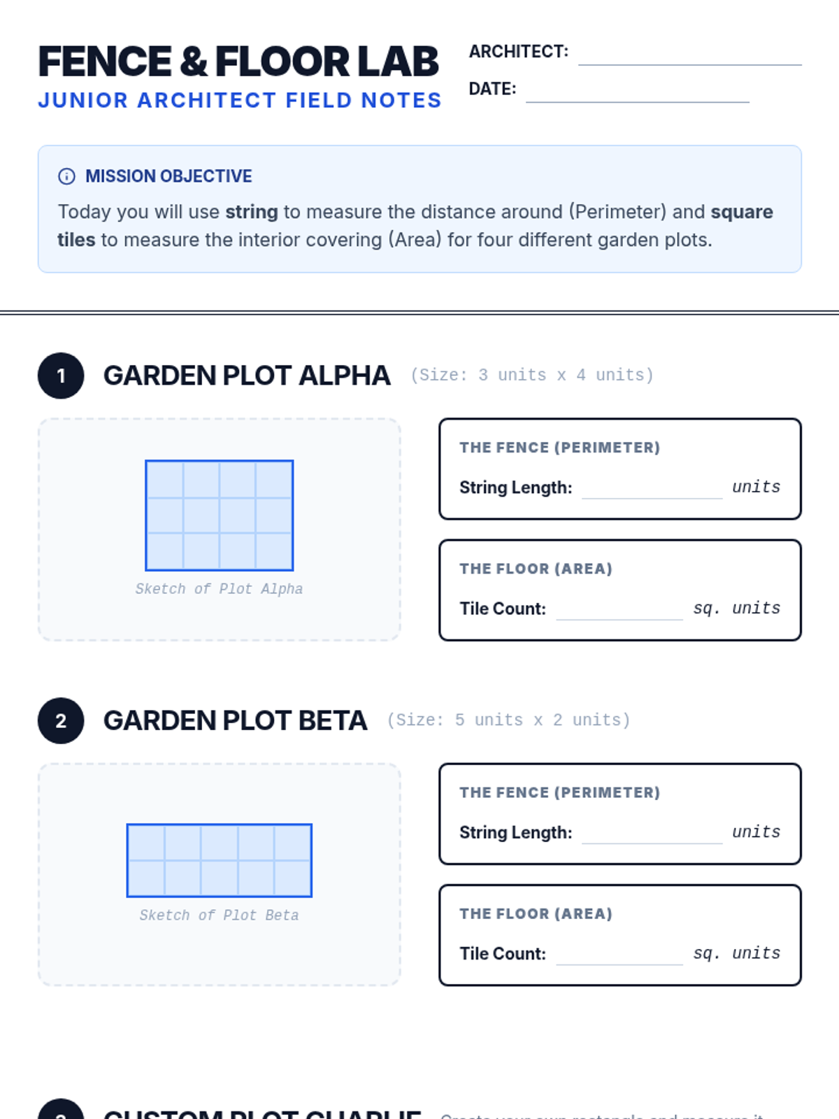 A comprehensive 4th Grade geometry unit focused on mastering area and perimeter of rectangles. Students act as 'Junior Architects' to explore formulas, missing dimensions, and complex shapes through blueprint-themed activities and investigations.