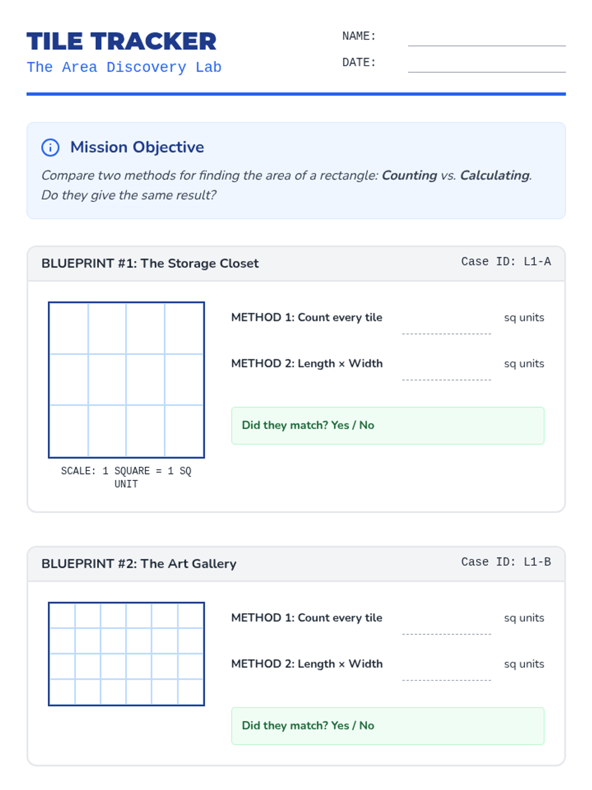 This sequence introduces the concept of area as an attribute of plane figures, distinguishing it from linear measurement. Students progress from tiling shapes with unit squares to discovering the relationship between side lengths and multiplication.