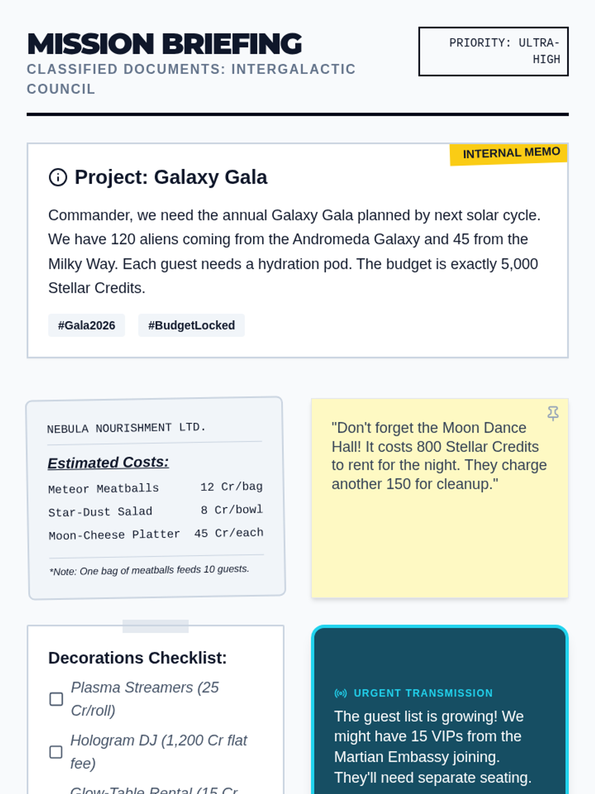 A 5-lesson project-based learning sequence where students plan a 'Galaxy Gala' to practice breaking down complex math problems. Students use scaffolding strategies like graphic organizers, tables, and estimation to manage a budget and handle project constraints.