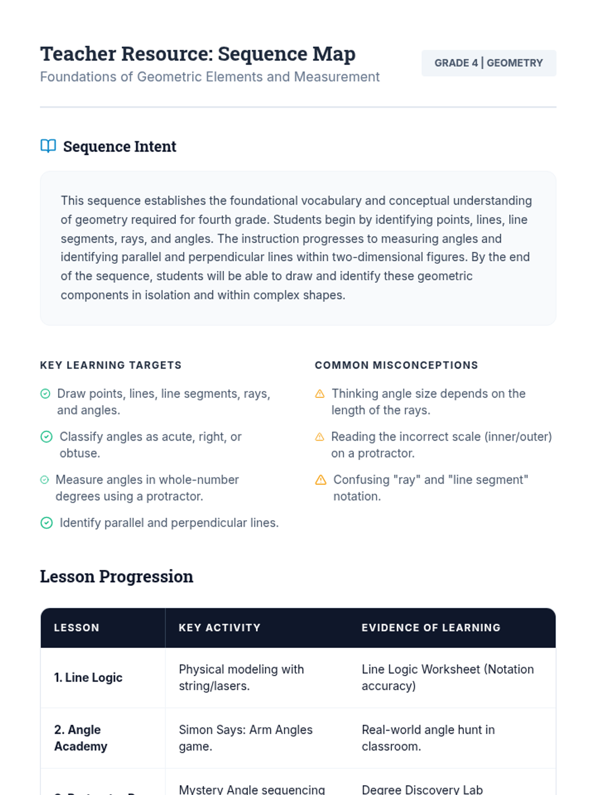 A comprehensive 4th-grade geometry sequence focusing on the foundations of geometric elements, including points, lines, angles, and measurement. Students transition from abstract definitions to practical application in drawing and identifying complex figures.