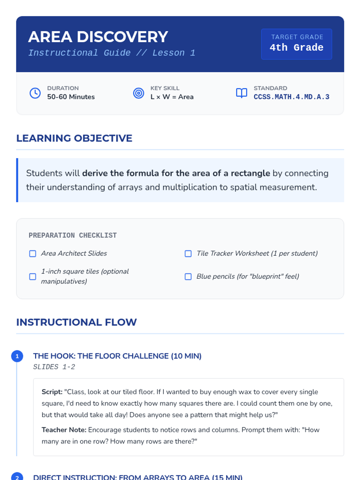 A comprehensive 4th-grade unit on calculating area and perimeter of rectangles. Students discover formulas through inquiry, build fluency in application, solve for missing dimensions, and analyze common measurement errors using a blueprint/architecture theme.