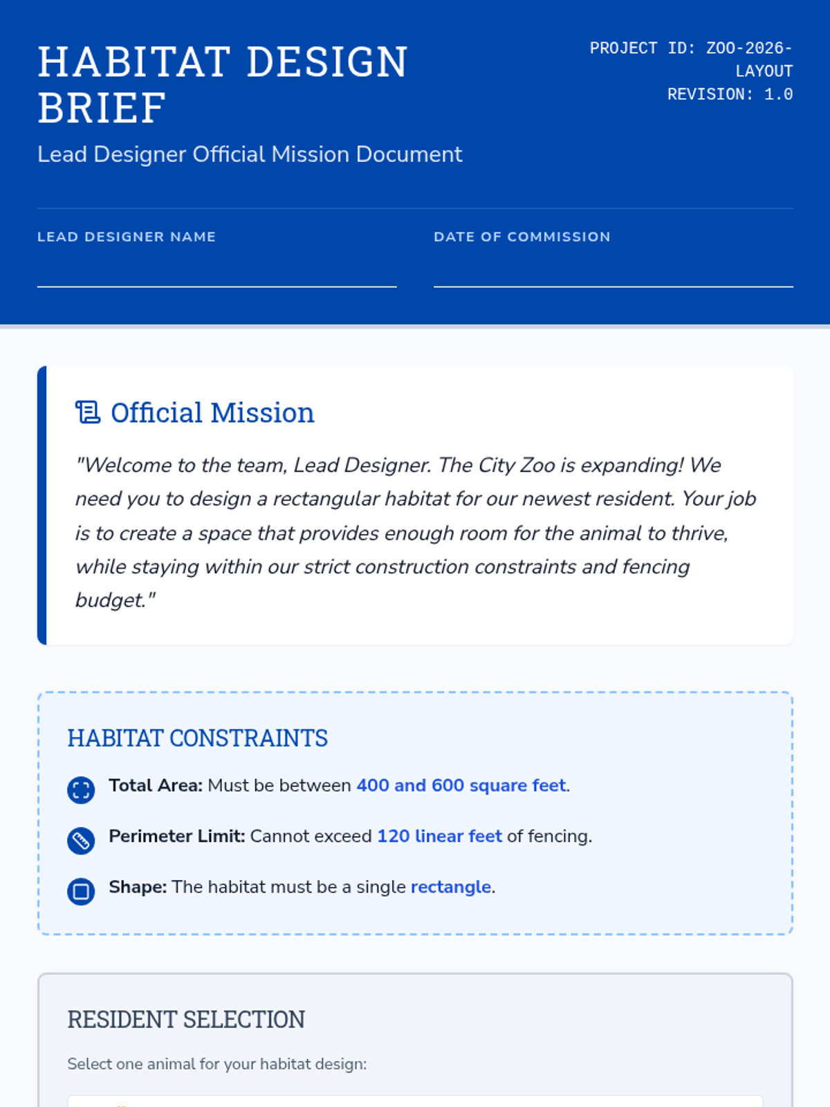 A project-based sequence where 4th-grade students act as lead designers for a new zoo habitat, using area and perimeter calculations to meet specific construction constraints and budgets.