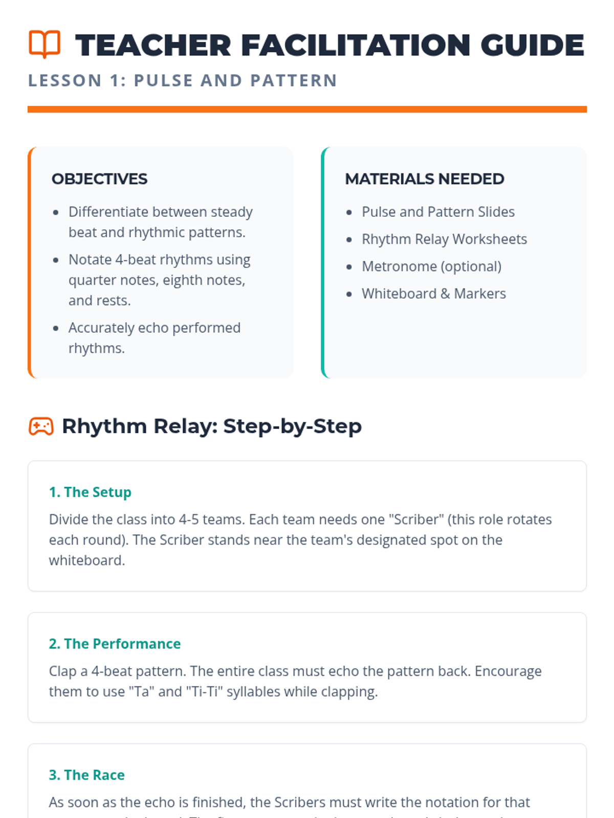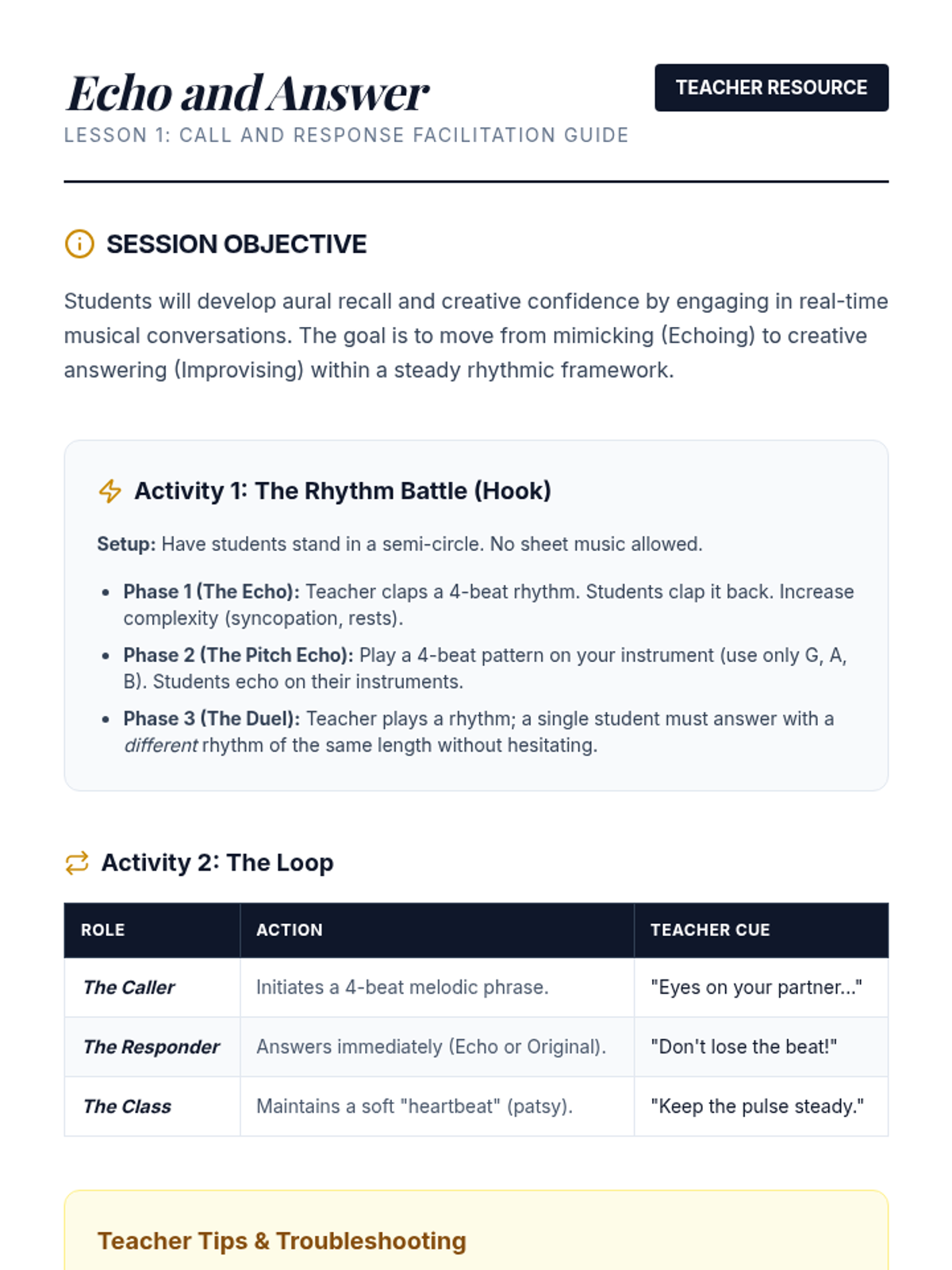 A 5-lesson journey into ensemble techniques, focusing on non-verbal communication, dynamic control, layering parts with ostinatos, and collaborative performance. Students develop the skills needed to listen, adjust, and play as a unified musical group.