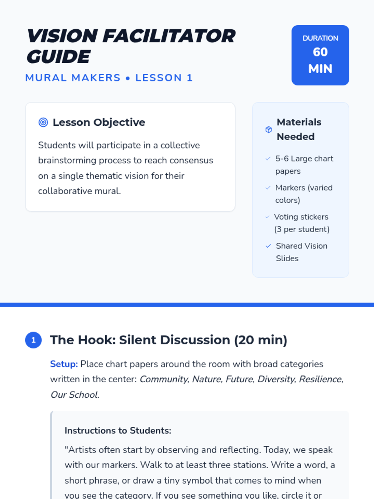 A 5-lesson sequence where students learn the art of collaboration by designing and executing a large-scale mural, moving from individual brainstorming to collective creation.