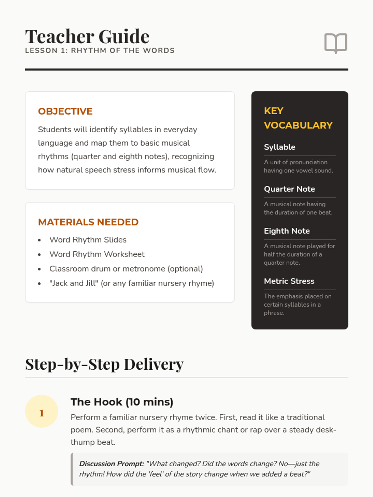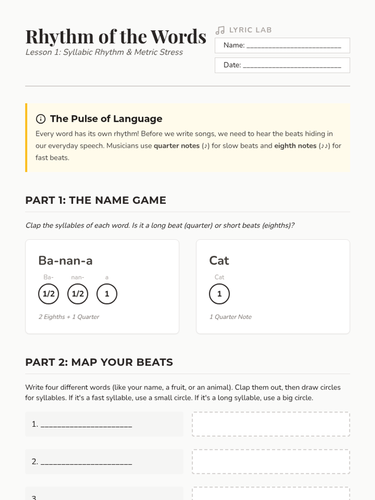This sequence explores the intersection of language and music, teaching 5th graders how to craft lyrics, understand song structures like verse and chorus, and set their words to rhythmic and melodic patterns. Students will progress from rhythm basics to performing their own original compositions.