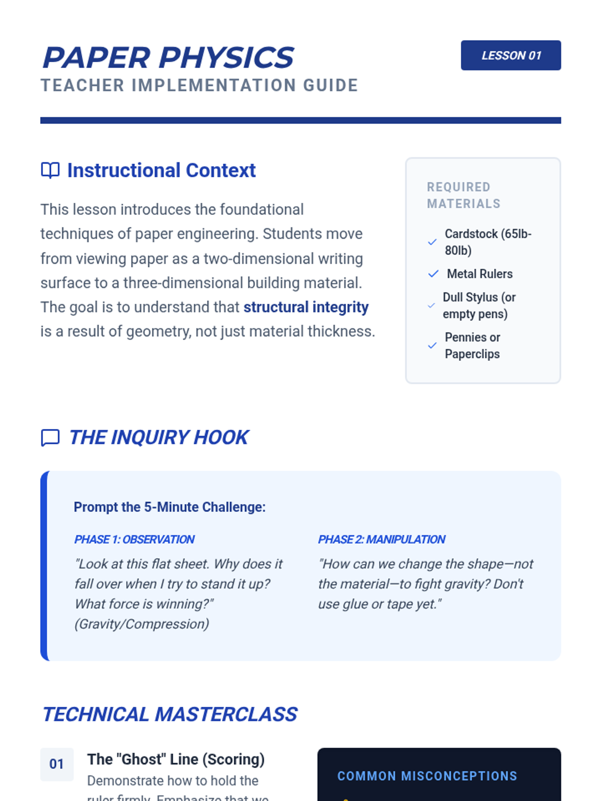This sequence explores the intersection of engineering and art through paper sculpture. Students investigate how a flimsy, flat material can be manipulated through folding, scoring, and slotting to become rigid and self-supporting, moving from basic relief to free-standing geometric construction.