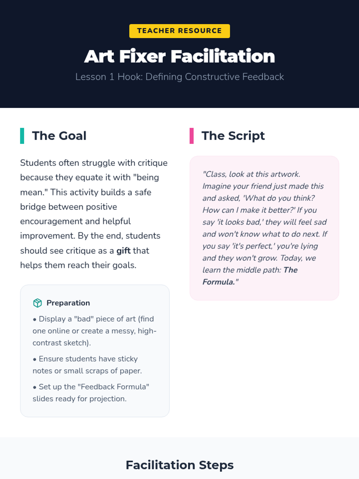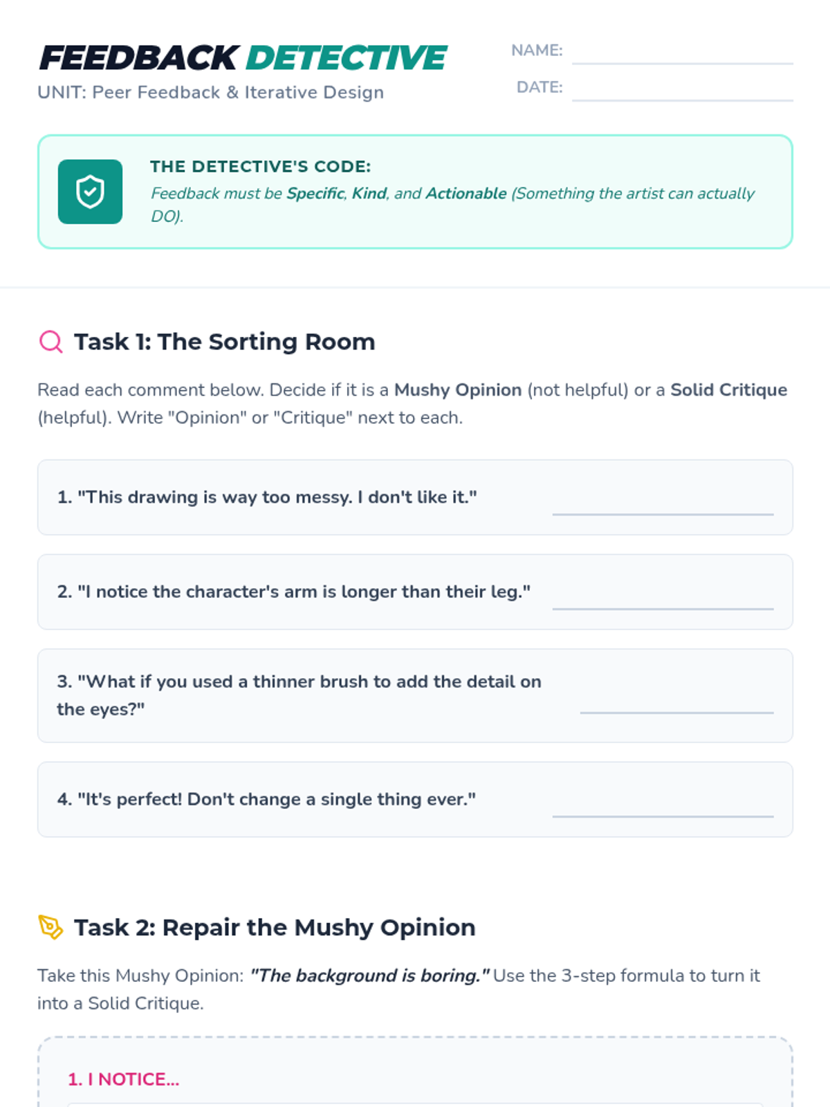 A 5th-grade arts sequence focused on the iterative process of creation through structured peer feedback, moving from initial drafts to final refined artworks using specific critique protocols.
