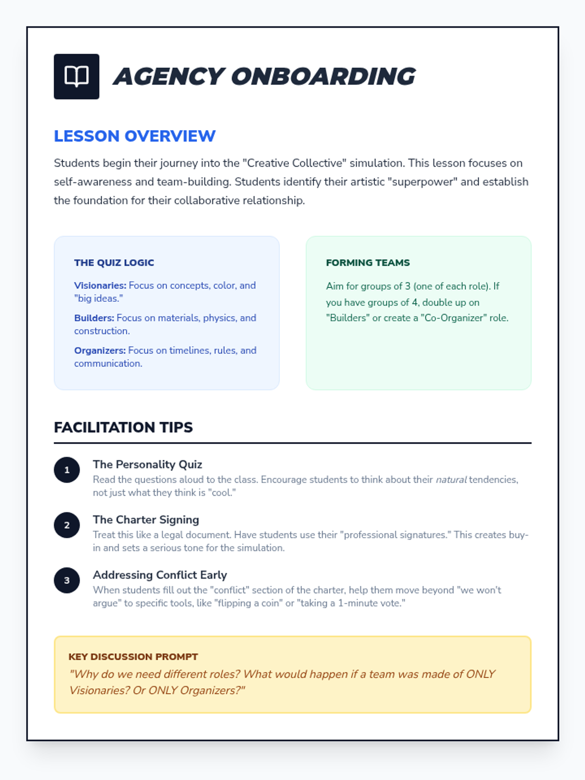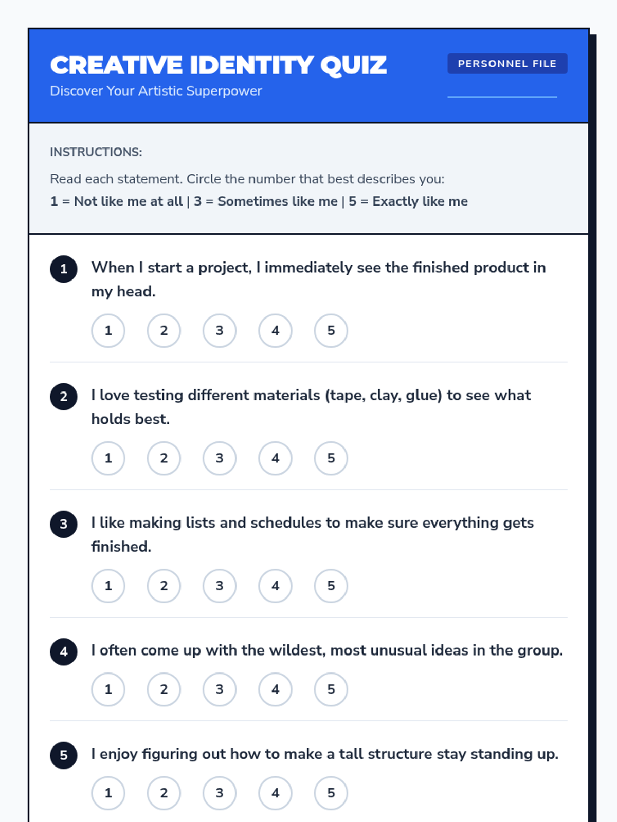 A 5th-grade arts sequence where students form design firms to solve a client-based mixed-media challenge. Students navigate roles, client twists, and collaborative prototyping to learn the value of diverse perspectives in the creative process.