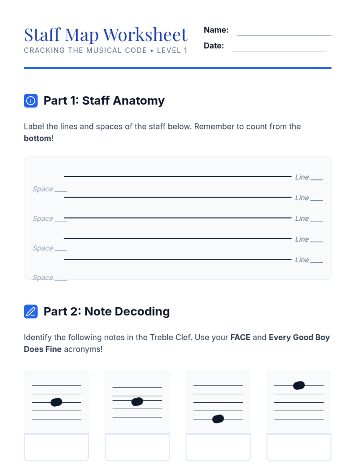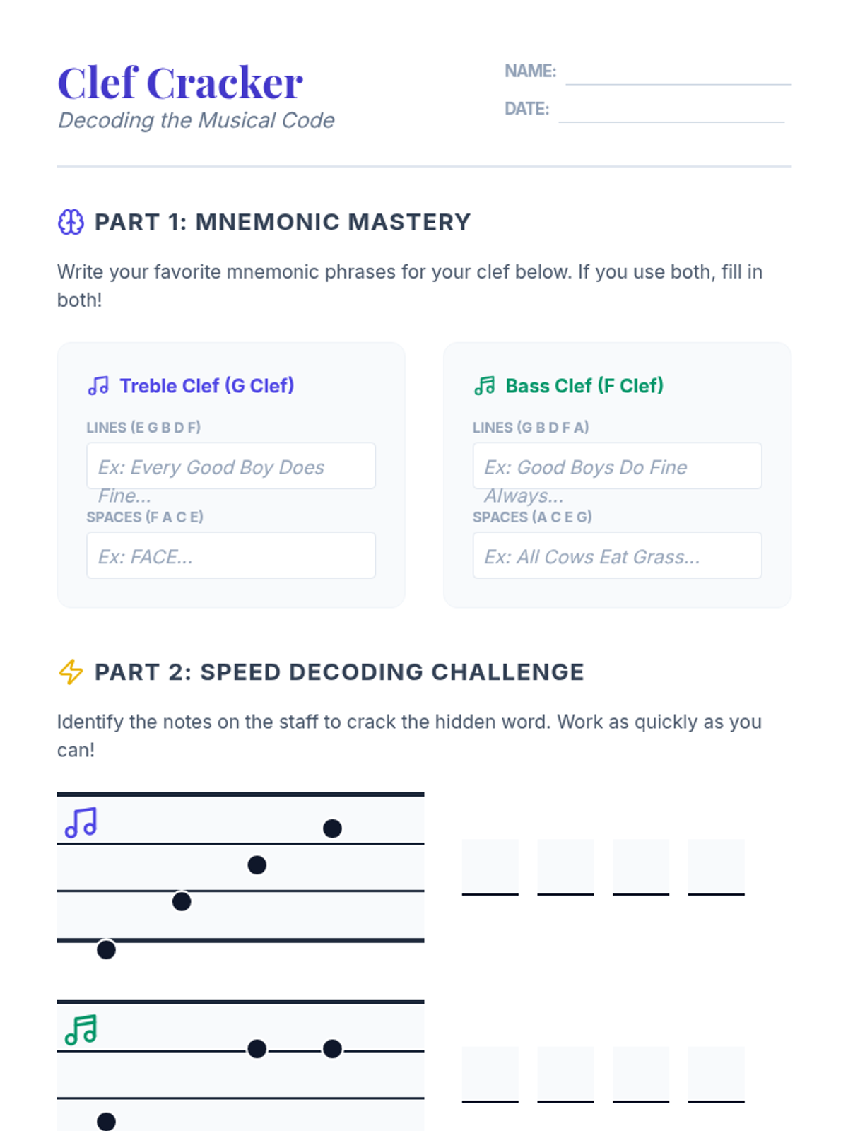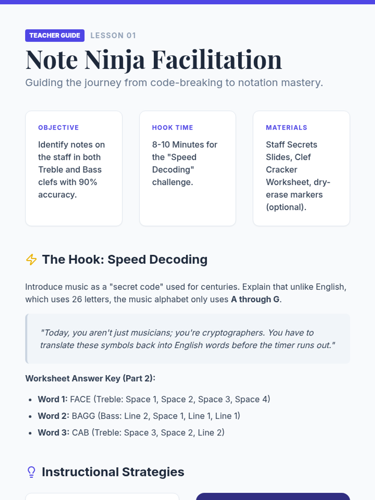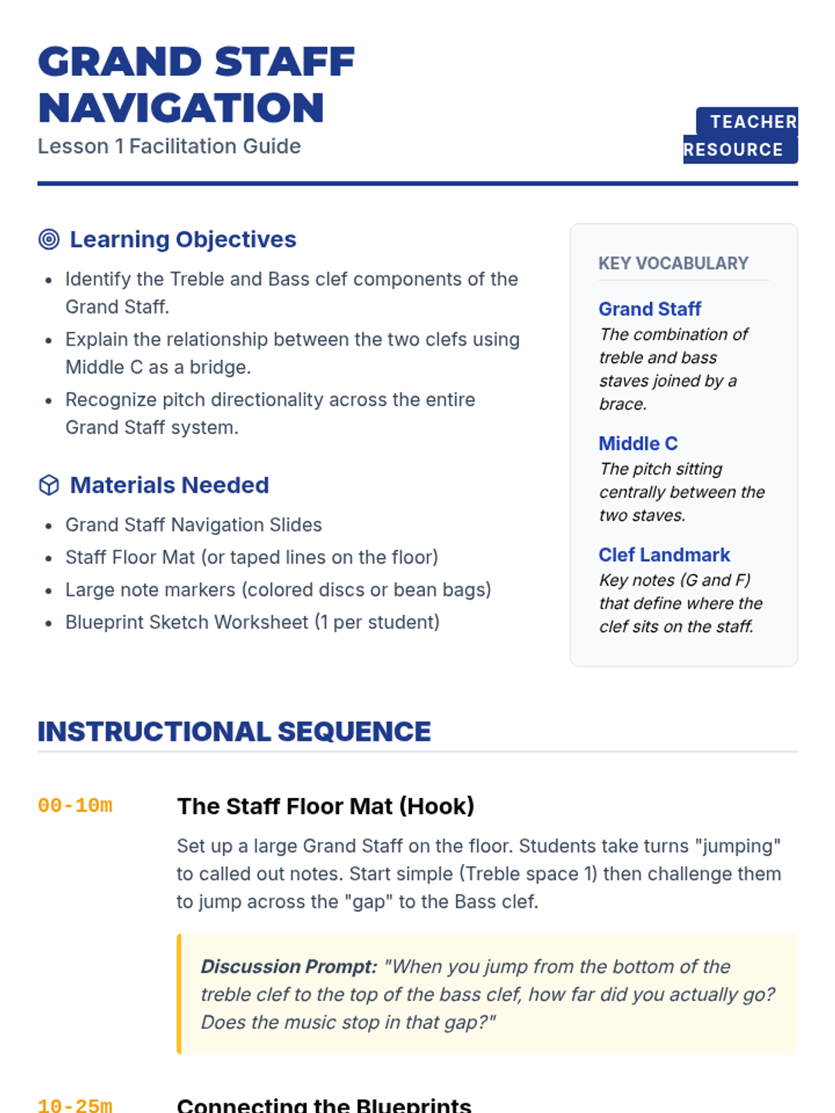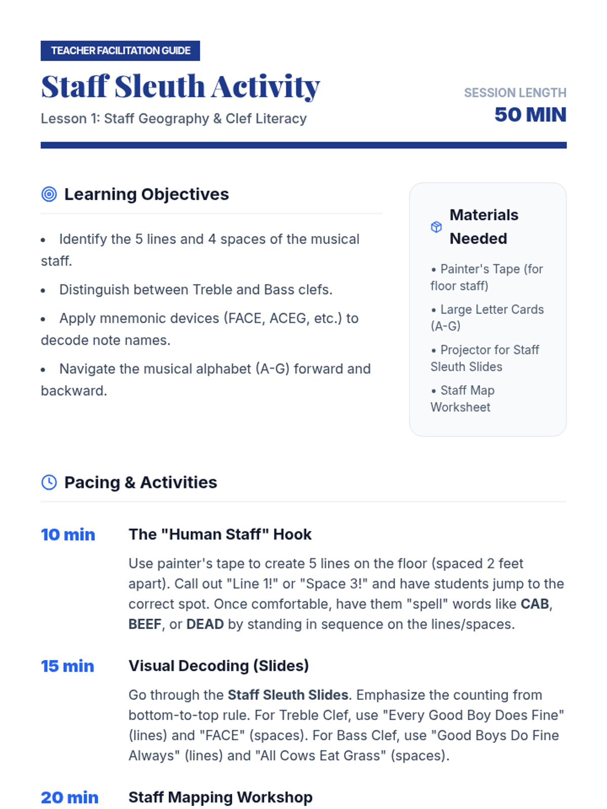 A comprehensive sequence for 5th-grade instrumental music students to master reading and playing music notation. Students progress from staff geography to rhythmic math, eventually sight-reading and transcribing melodies, treating notation as a code for performance.