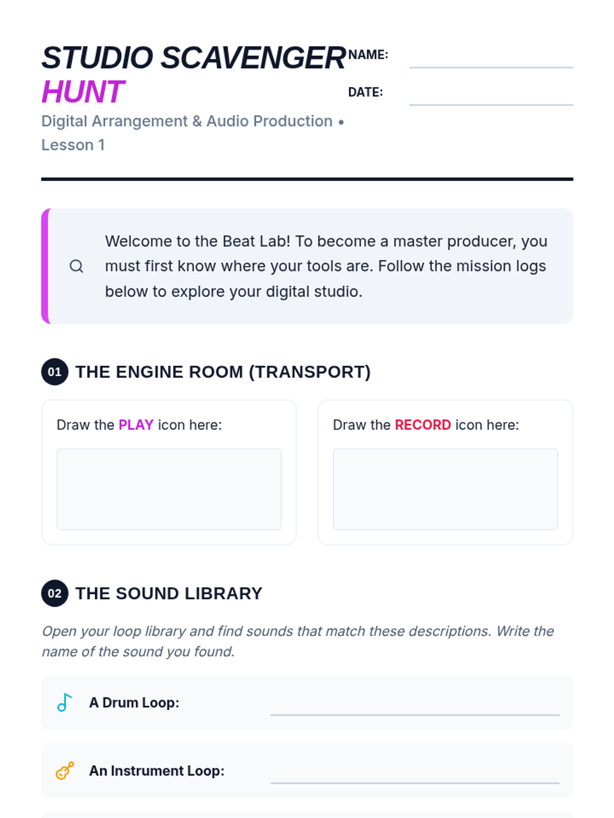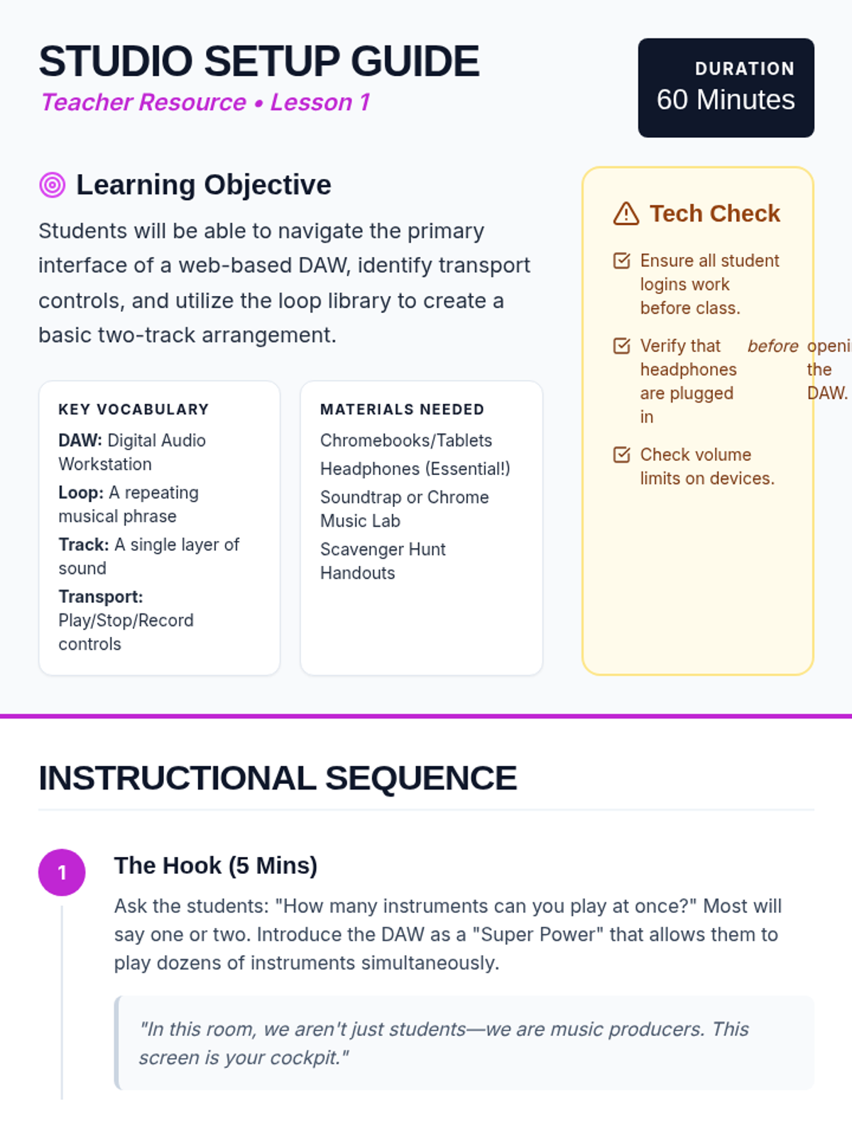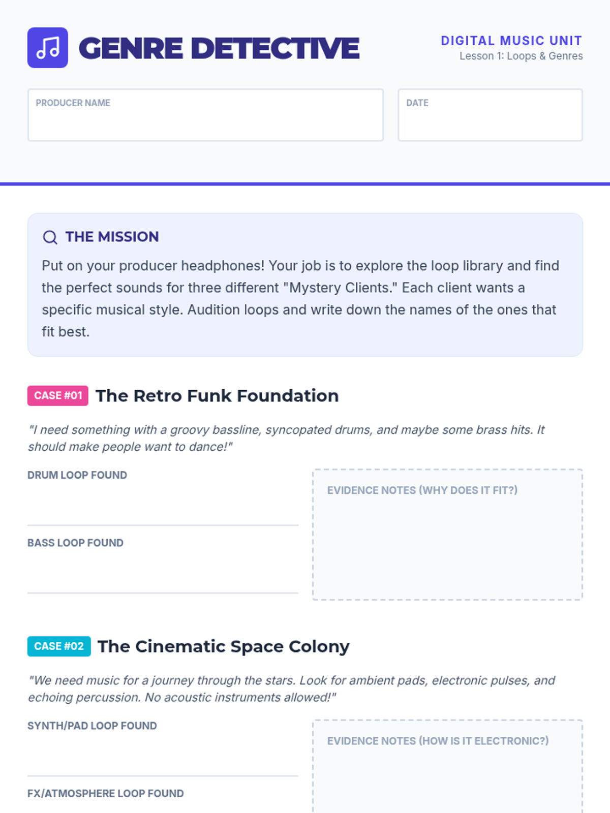 A 4th-grade music production unit where students use digital audio workstations (DAWs) to compose, arrange, and mix original music. Students learn about timbre, texture, song structure, and digital literacy through the lens of a modern music producer.
