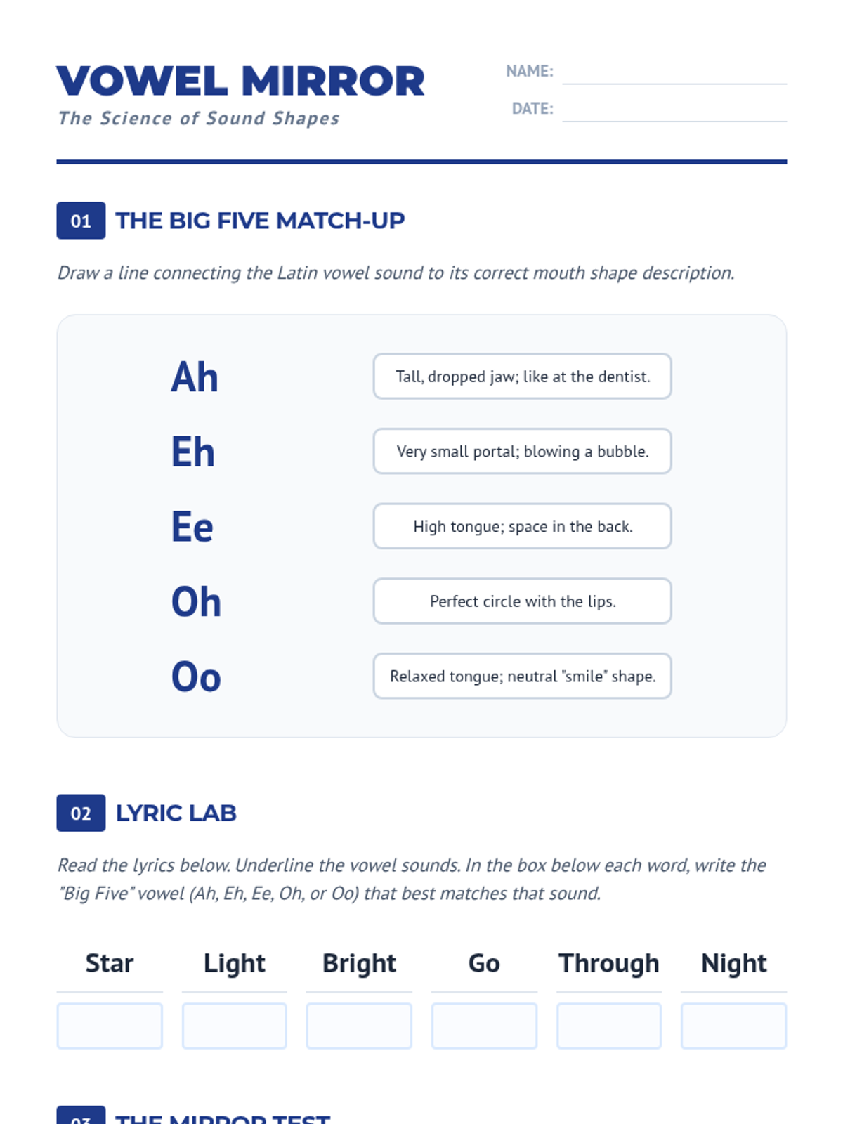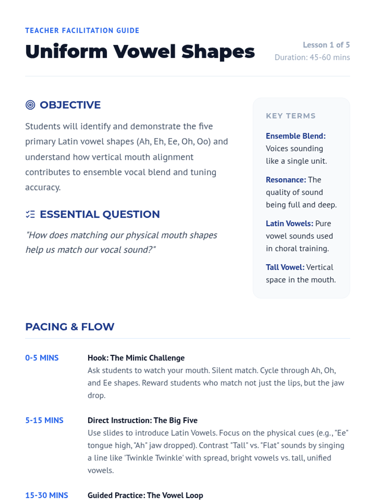 This sequence guides 5th-grade students through the technical aspects of vocal diction, focusing on vowel uniformity, consonant precision, diphthong management, and vocal agility. Students will learn how to improve their singing clarity and ensemble blend through practical exercises and performance application.