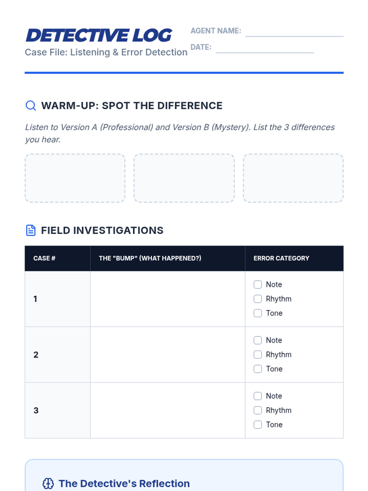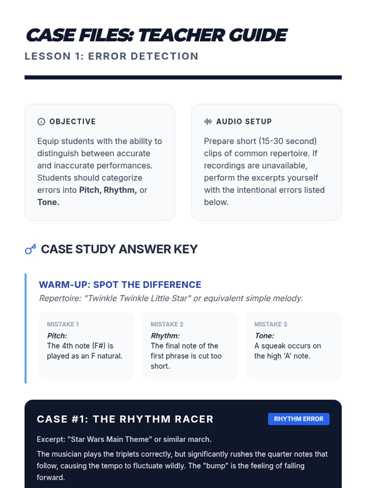 This sequence empowers 5th-grade musicians to become independent learners by mastering critical listening, error detection, and strategic practice techniques. Students transition from identifying performance mistakes in others to self-diagnosing and creating personalized practice blueprints for technical growth.