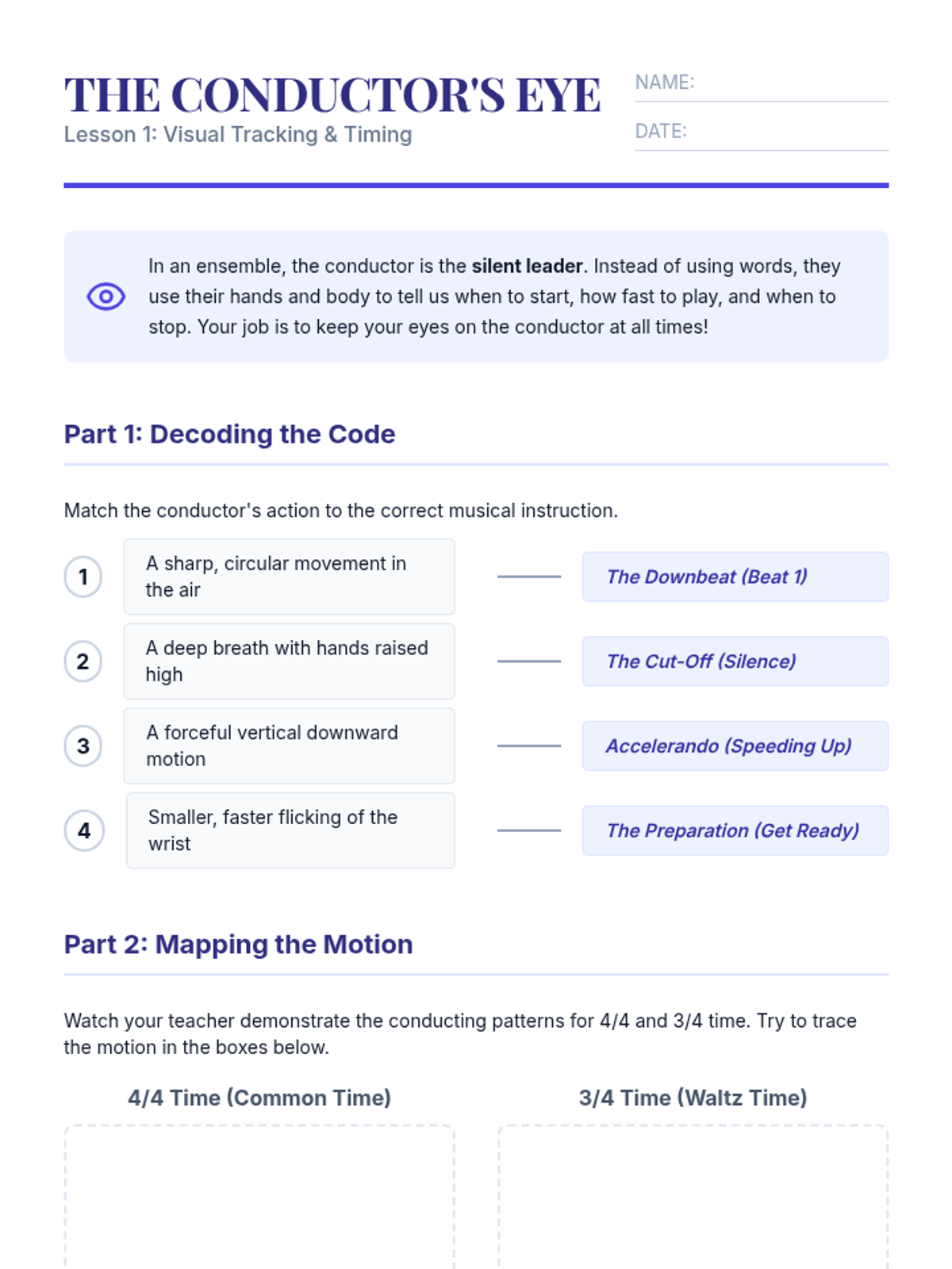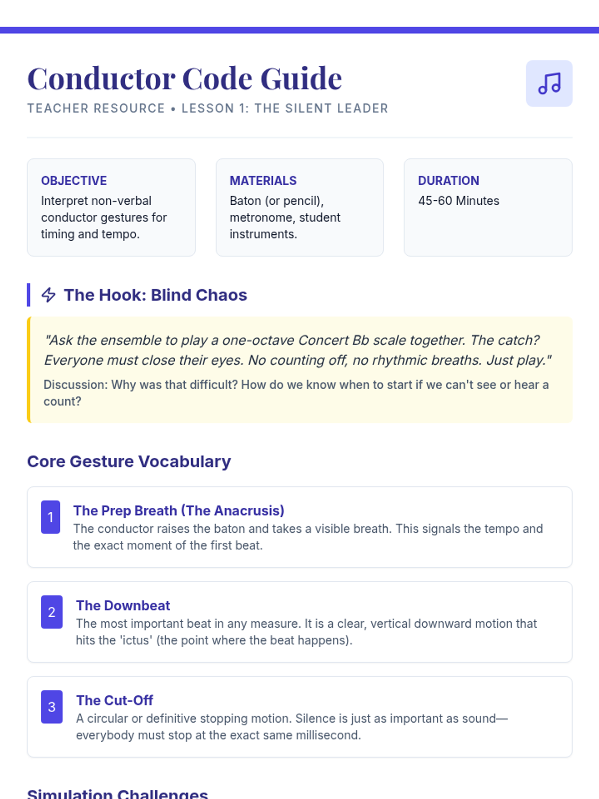 This sequence explores how musicians work together as an ensemble, focusing on conducting cues, dynamic control, balance, and tempo maintenance. Students transition from following a leader to collaborating in small independent groups.