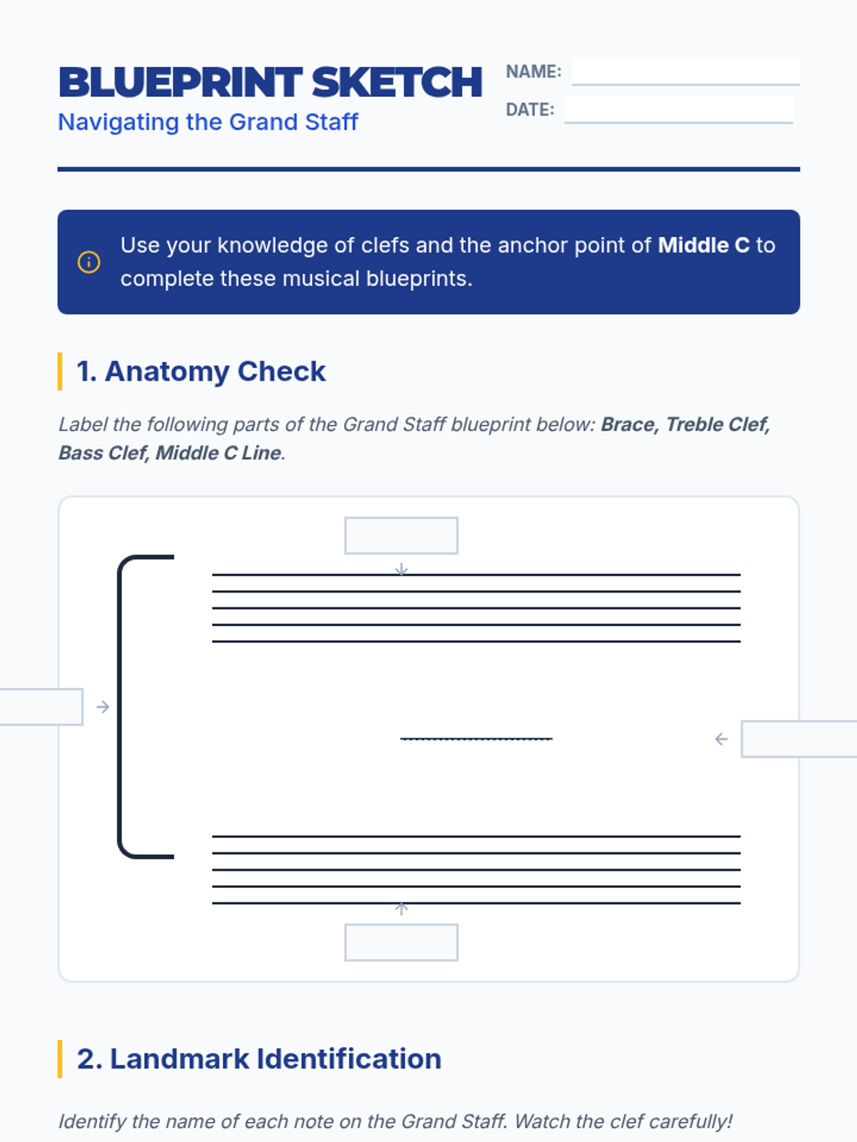 A comprehensive unit for 5th-grade musicians covering the mechanics of pitch organization, from the Grand Staff and ledger lines to the mathematical construction of major scales and key signatures.