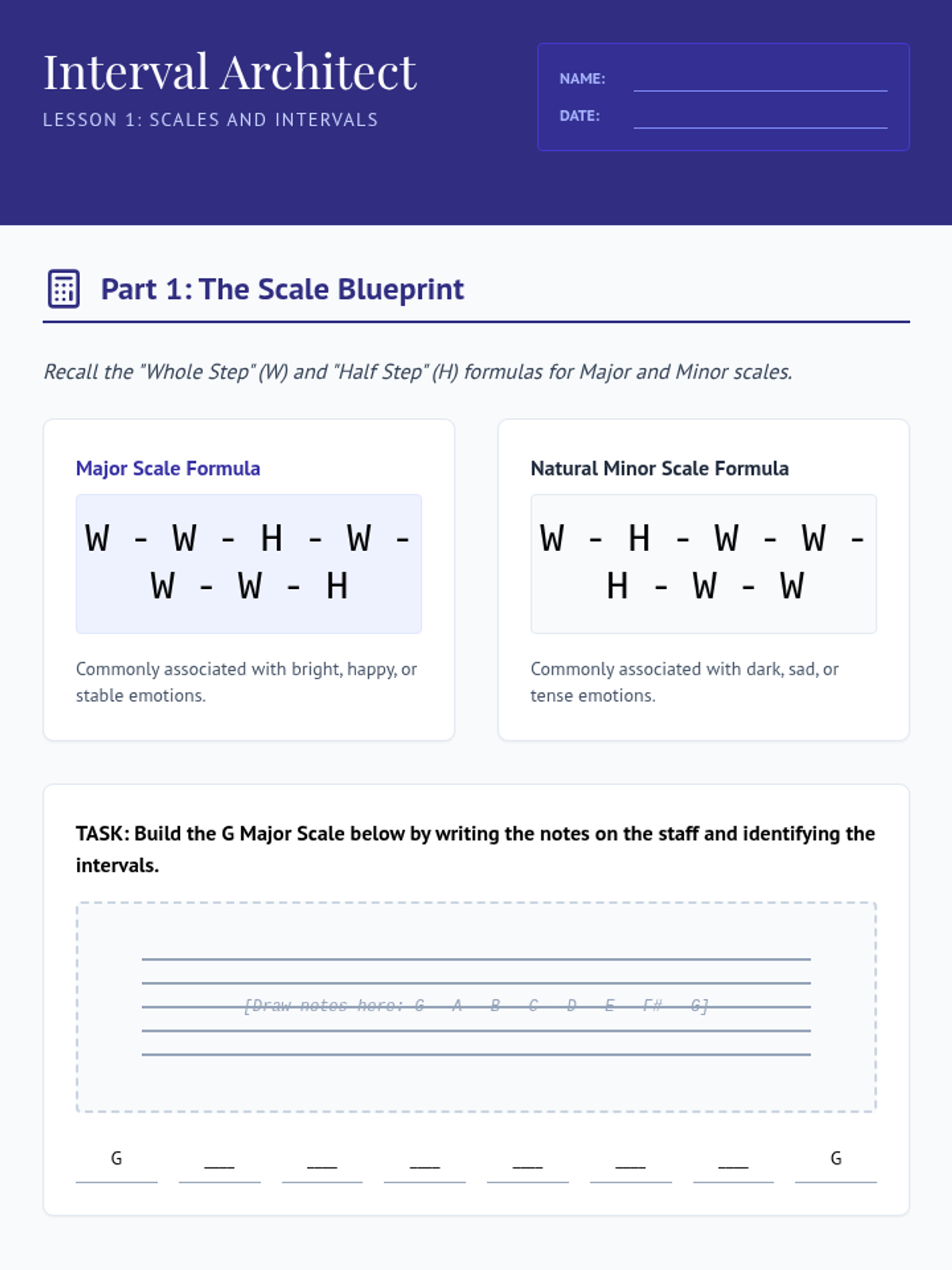 A music theory unit for 5th graders focused on intervals and triads. Students transition from melodic thinking to harmonic construction through 'blueprint' themed activities, building from simple distance measurement to complex chord progressions.