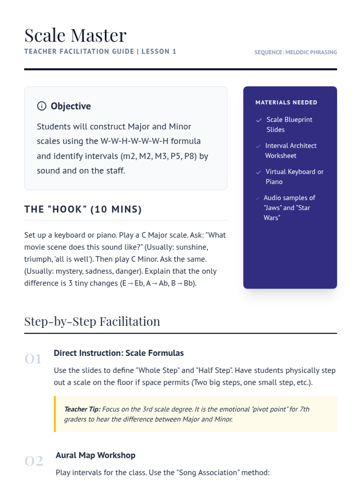 A comprehensive unit on melodic construction, focusing on scales, contour, motif development, and phrasing. Students progress from basic pitch relationships to composing their own melodic etudes with emotional intent.