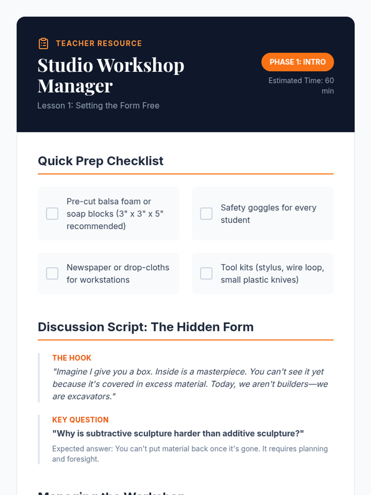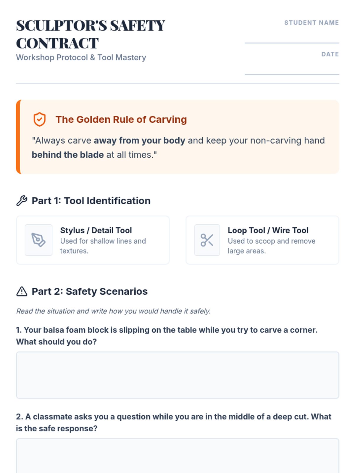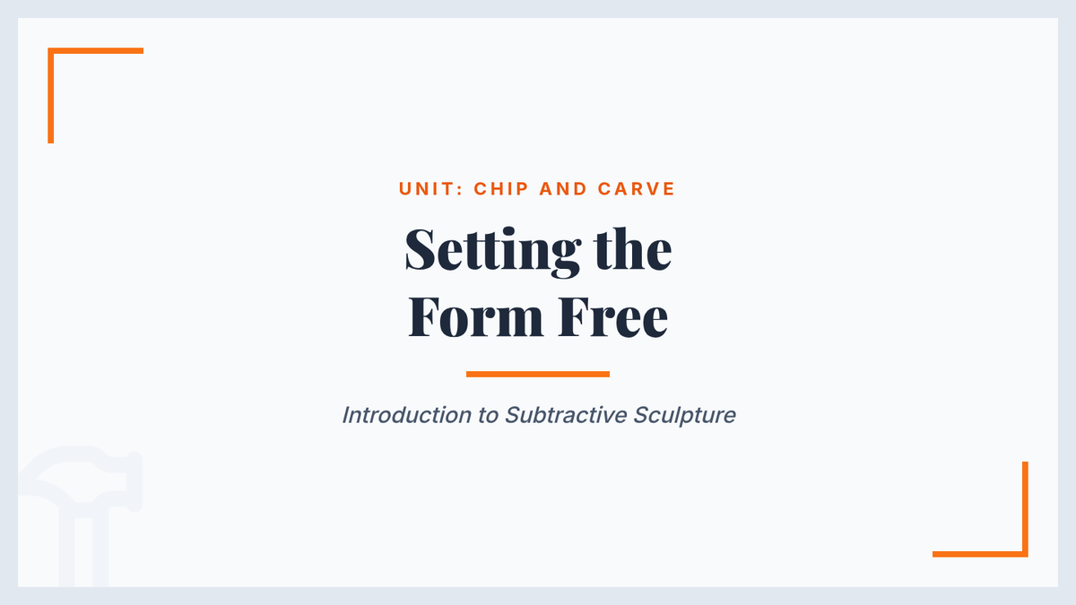A 5th-grade art sequence exploring subtractive sculpture. Students learn to plan, rough out, and refine 3D forms from blocks of soap or foam, shifting from additive to subtractive thinking.