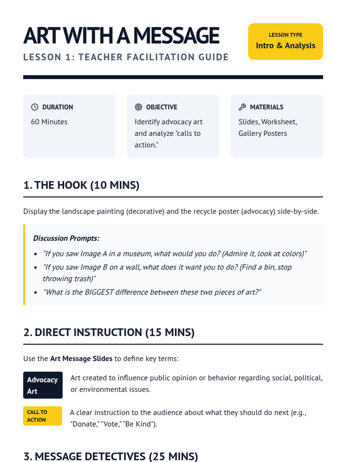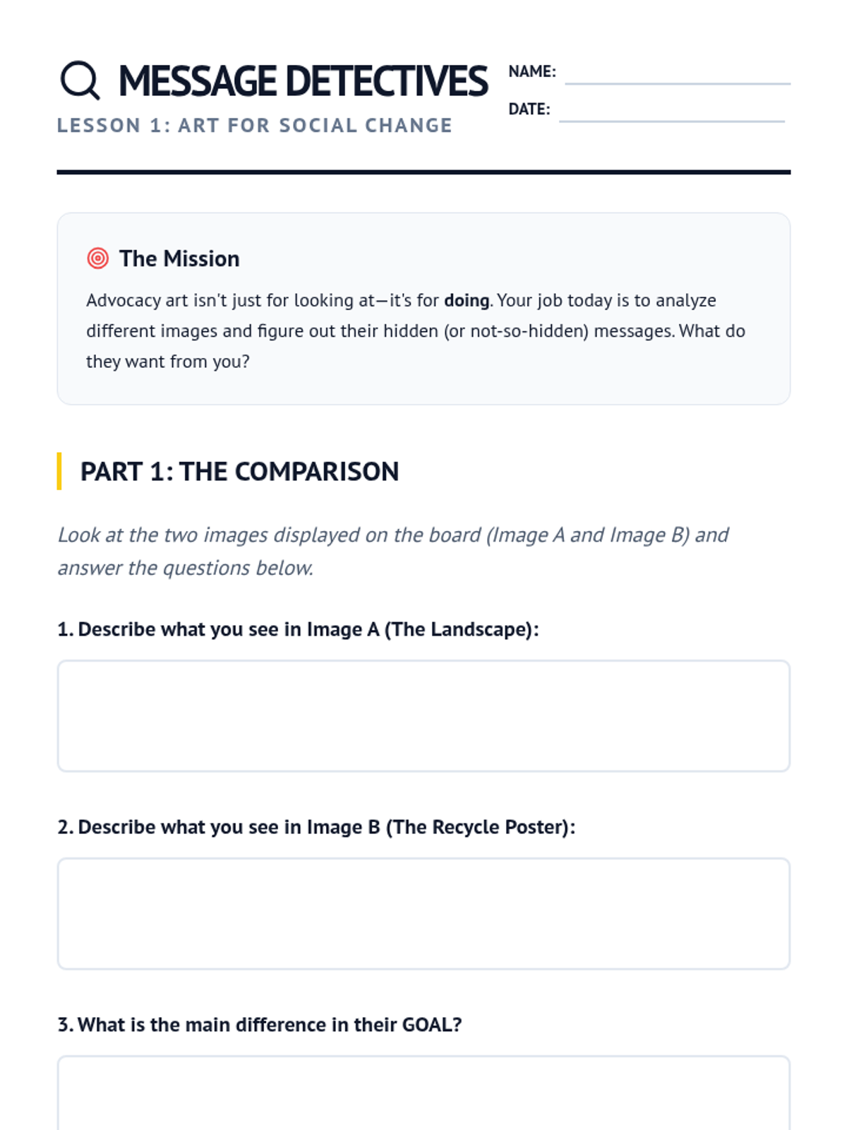 A 5th-grade arts sequence where students explore how visual art and graphic design can be used for social advocacy, culminating in the creation of a persuasive poster for a community cause.