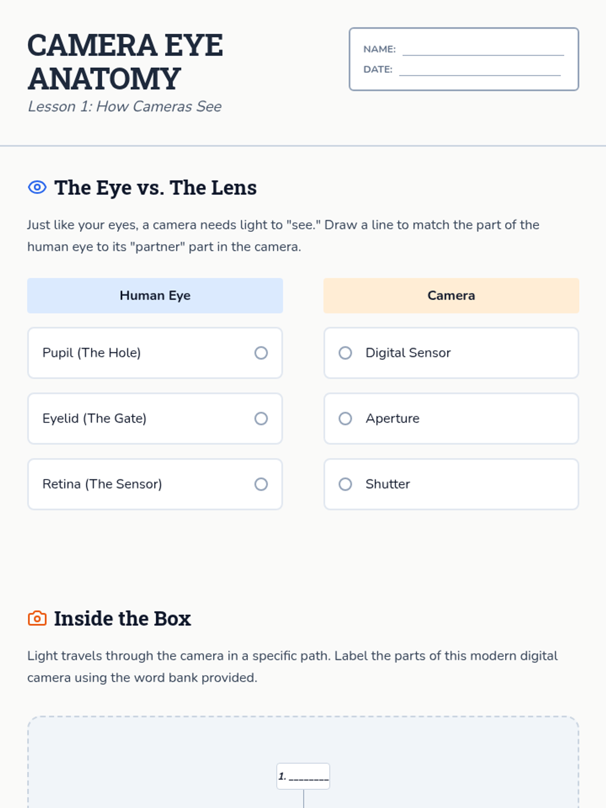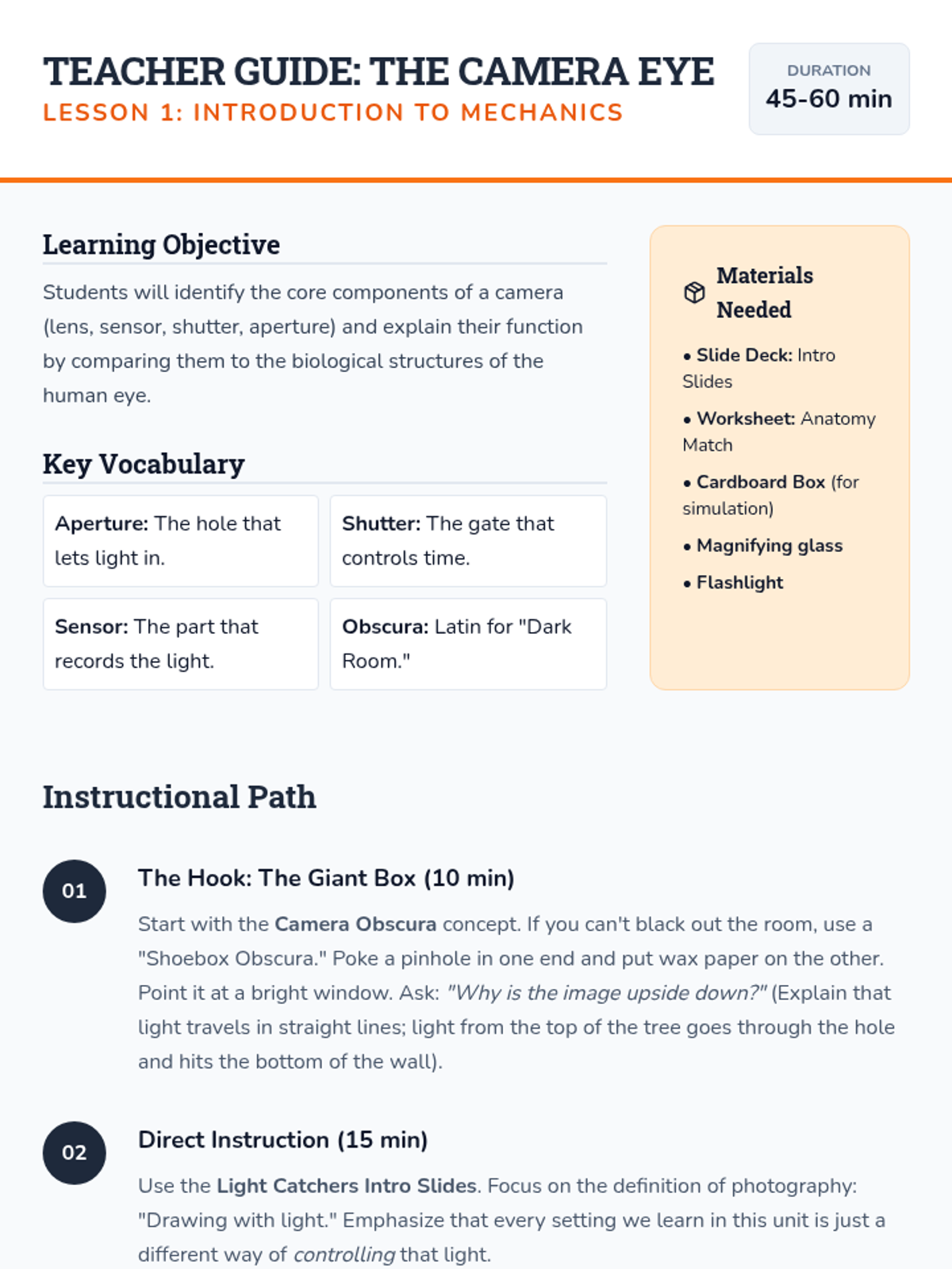 This technical sequence demystifies how a camera captures images, focusing on simplified Exposure Triangle concepts for 5th graders. Students explore how shutter speed, focus, and light levels affect their photos, moving from 'auto' mode to intentional control.