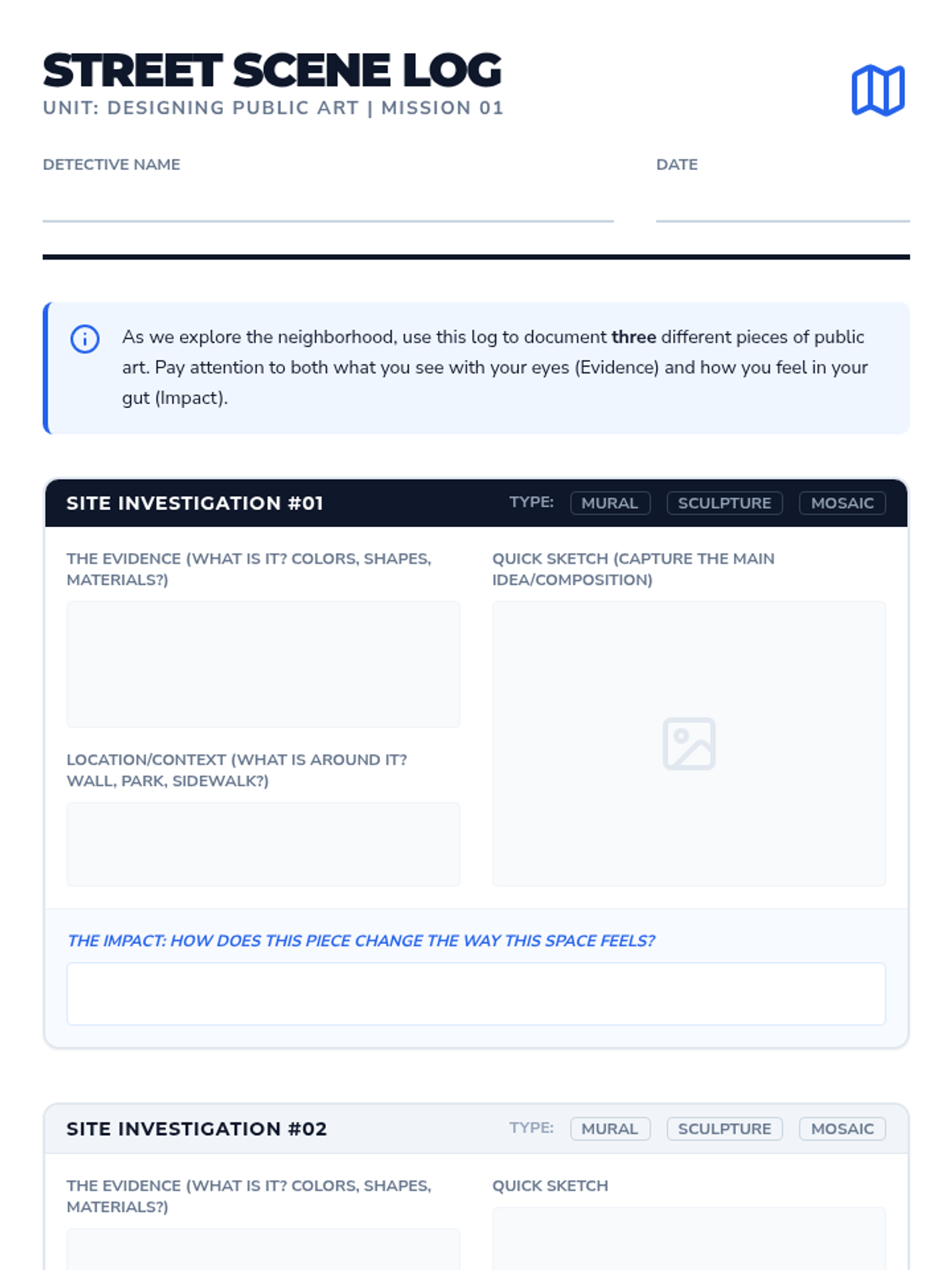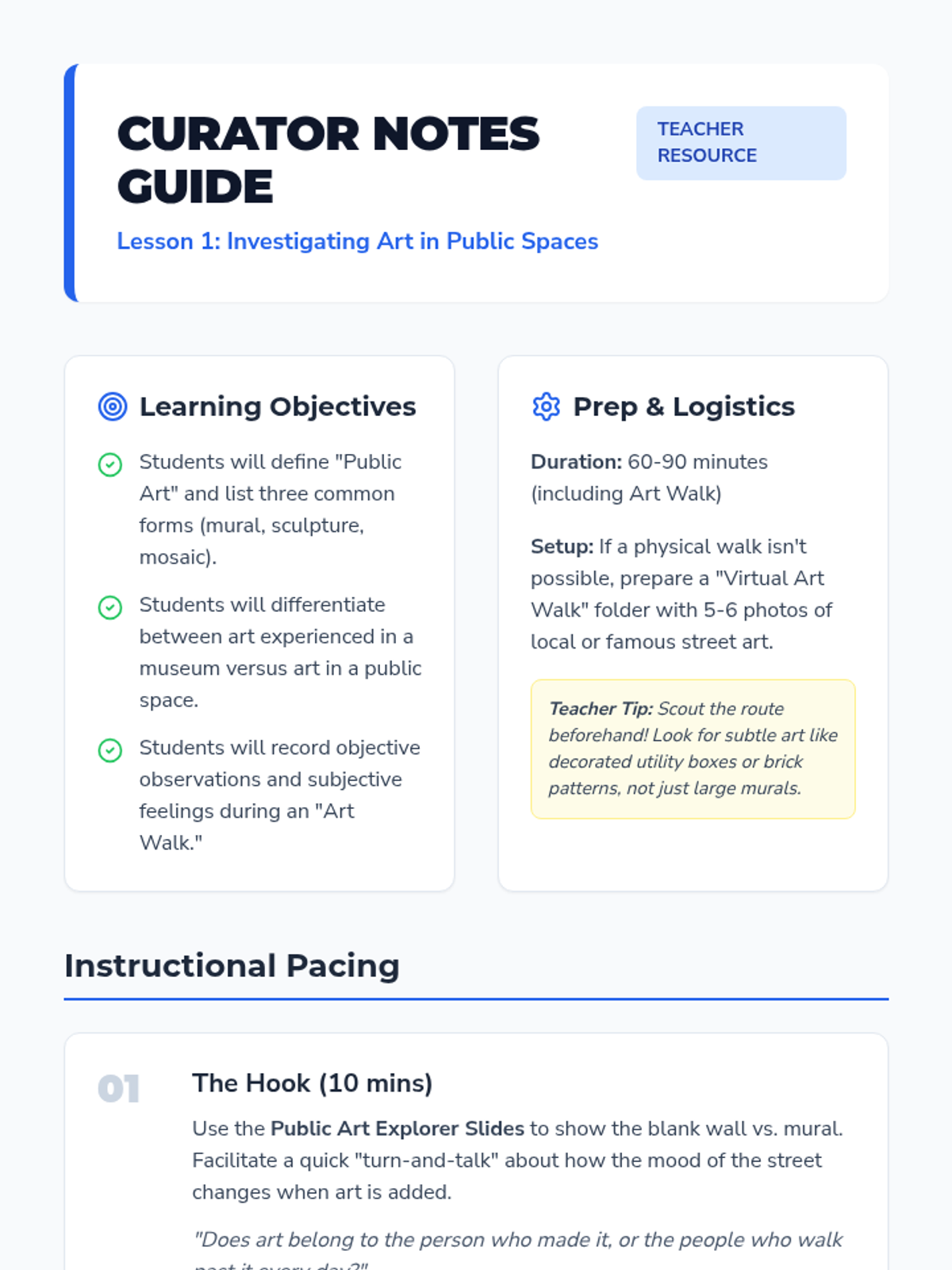 A project-based unit where 5th-grade students analyze public art and design their own community-based installation proposal. They move from observation and symbolism analysis to community research and final architectural-style pitches.