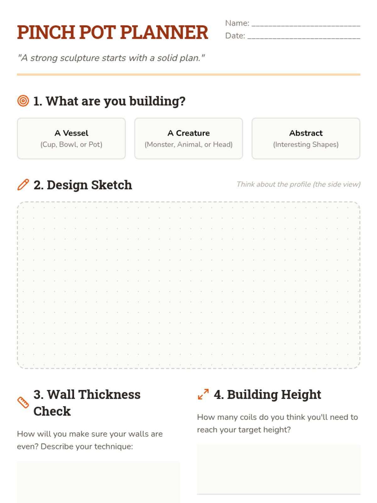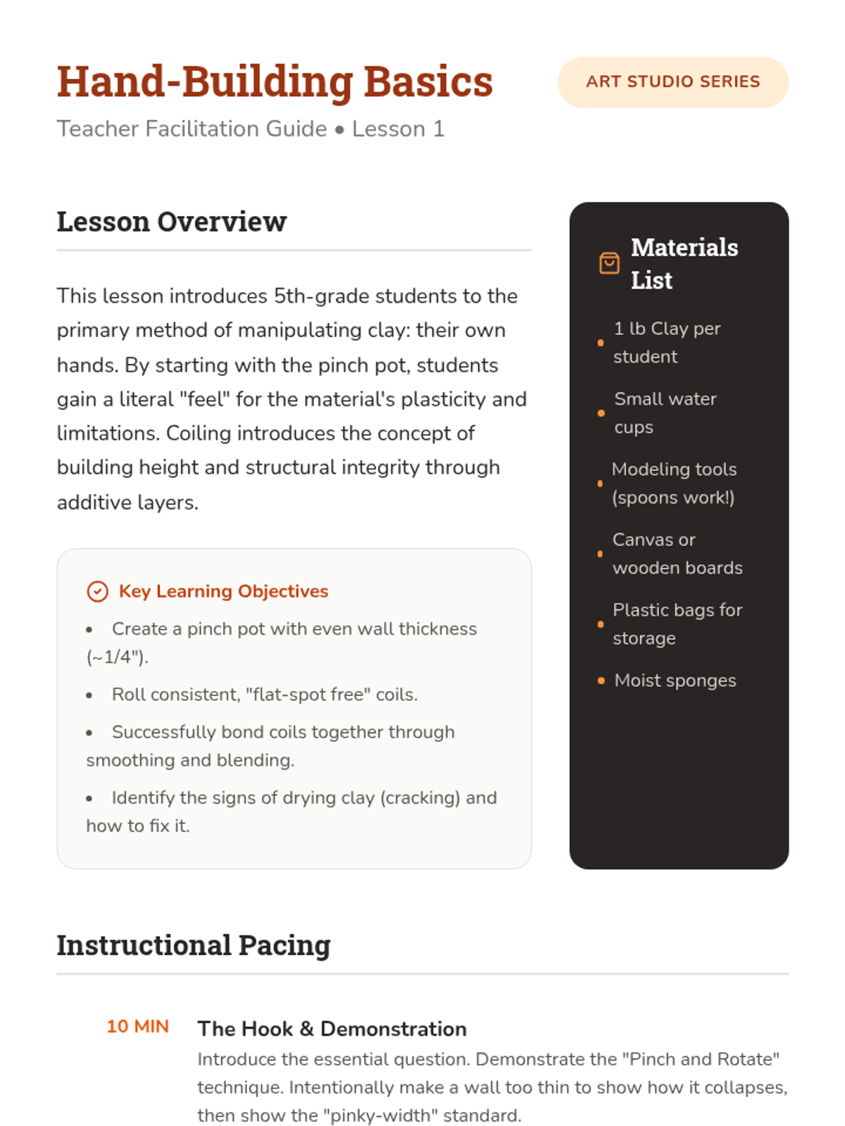 A comprehensive 5th-grade sequence on hand-building techniques, focusing on pinch, coil, slab construction, and surface texture in ceramics. Students explore the structural integrity of clay and intentional surface design.