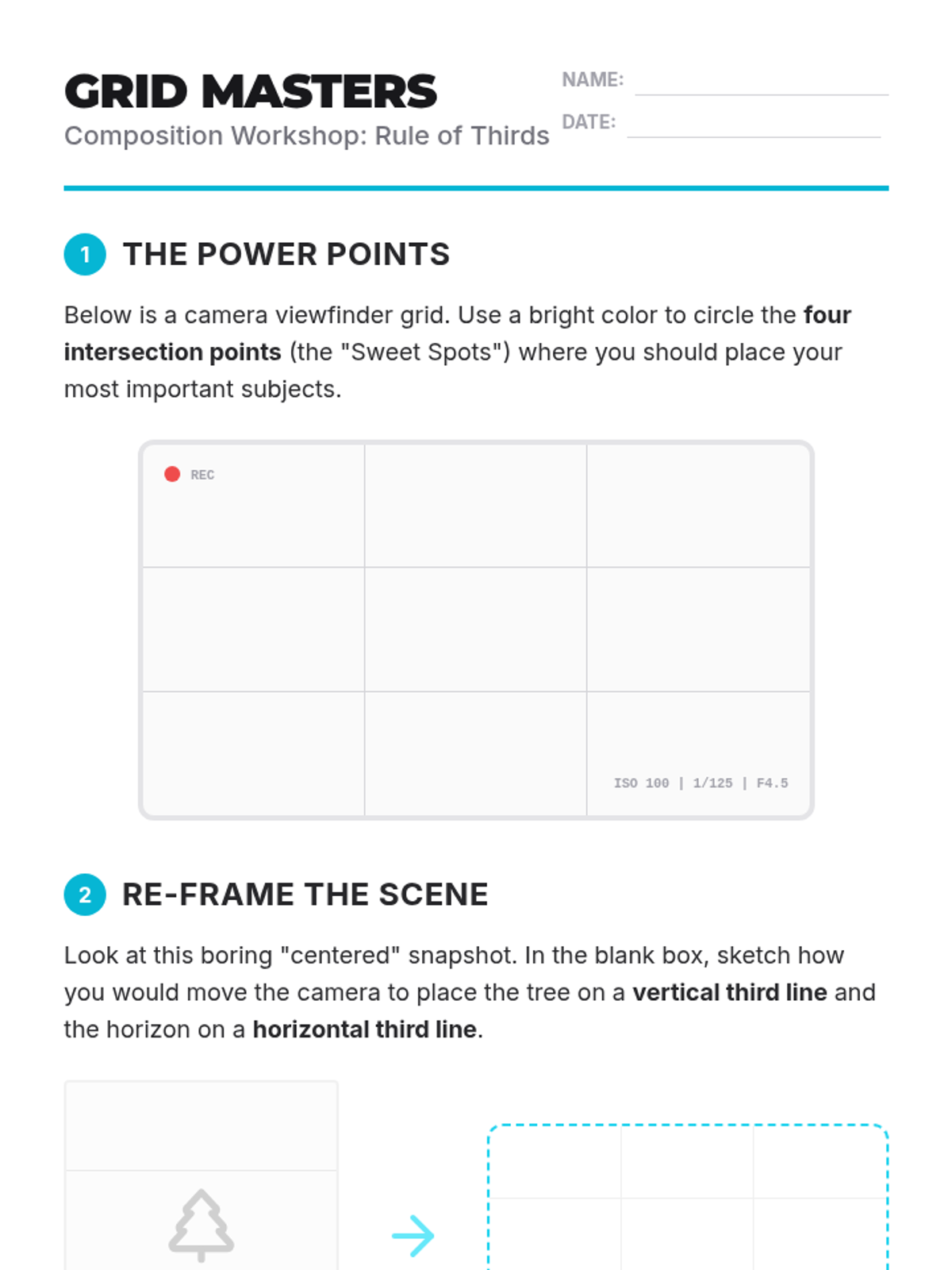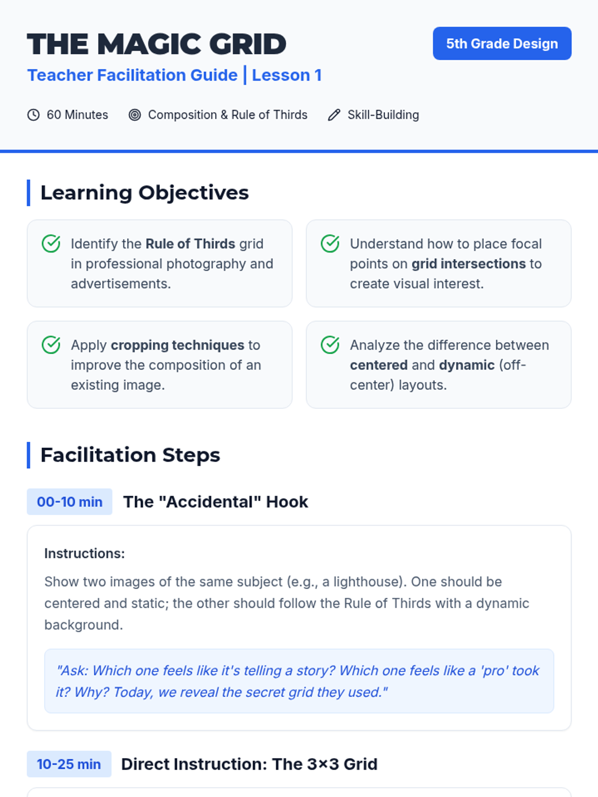 A photography sequence for 5th graders focused on composition, framing, and artistic intent. Students transition from simple snapshots to intentional captures using professional techniques like the Rule of Thirds, leading lines, and perspective shifts.