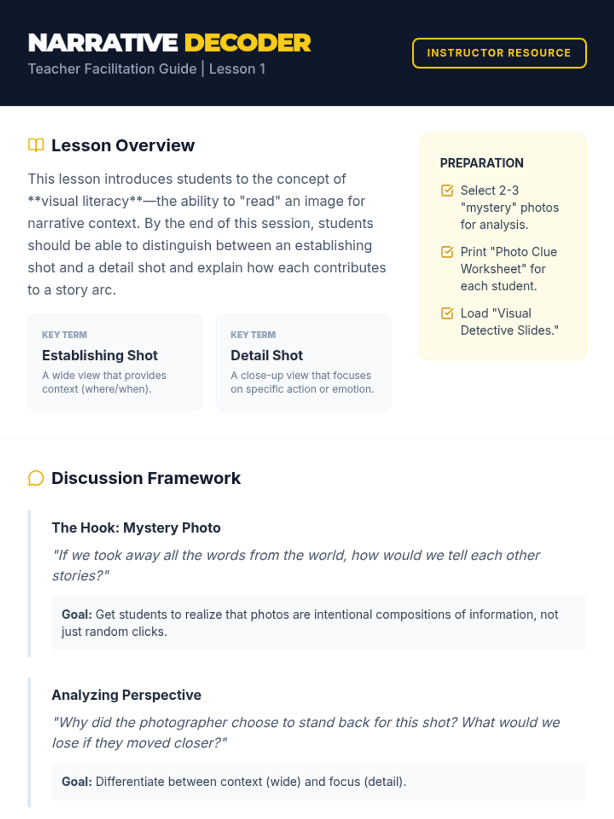 A photography sequence for 5th graders focused on visual storytelling. Students learn to transition from taking single photos to creating cohesive narrative photo essays using techniques like shot variety, candid timing, and editorial curation.