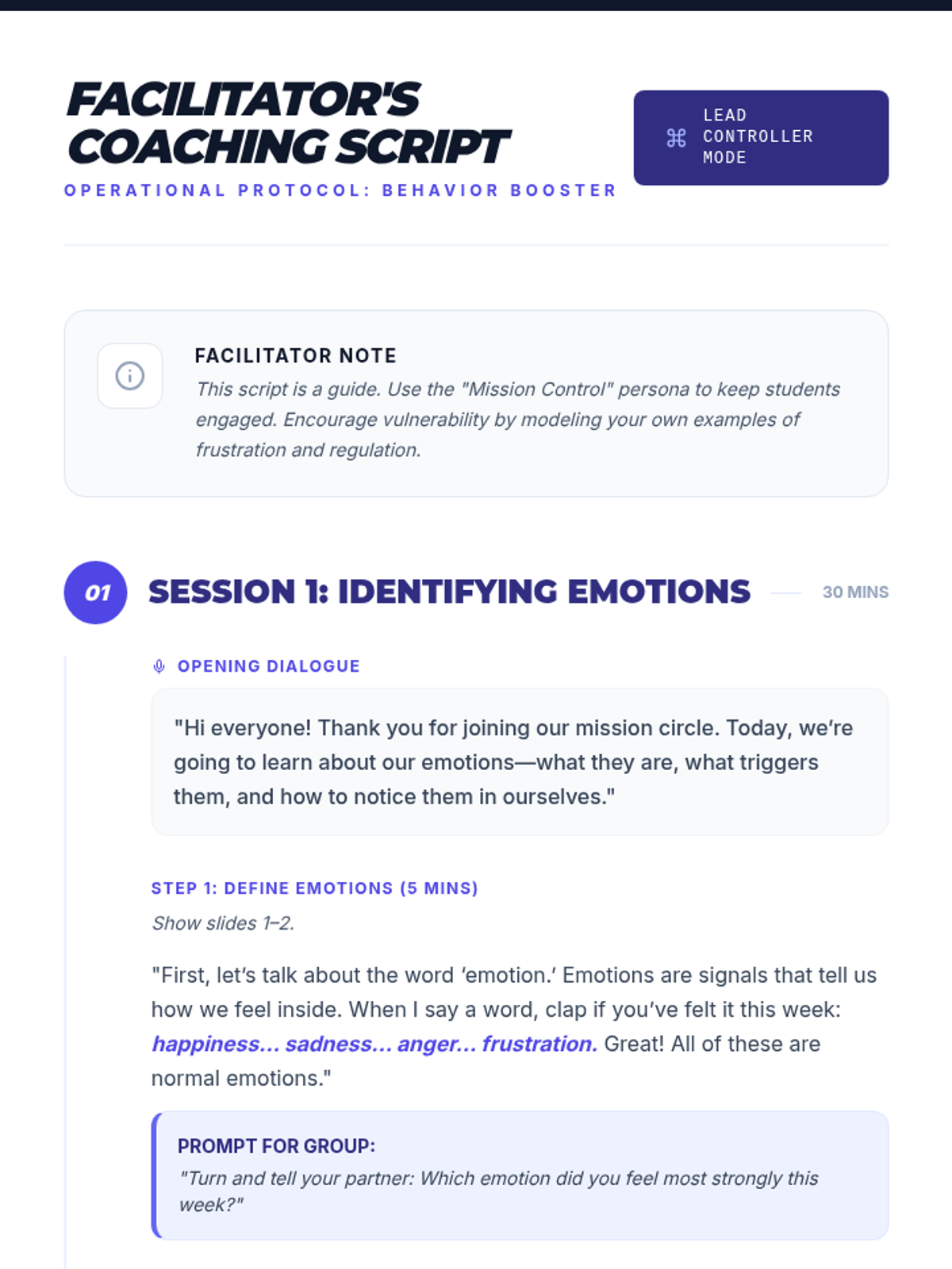A 6-week behavior academy sequence for elementary students focusing on impulse control, emotional regulation, and following directions through engaging "bootcamp" style training.