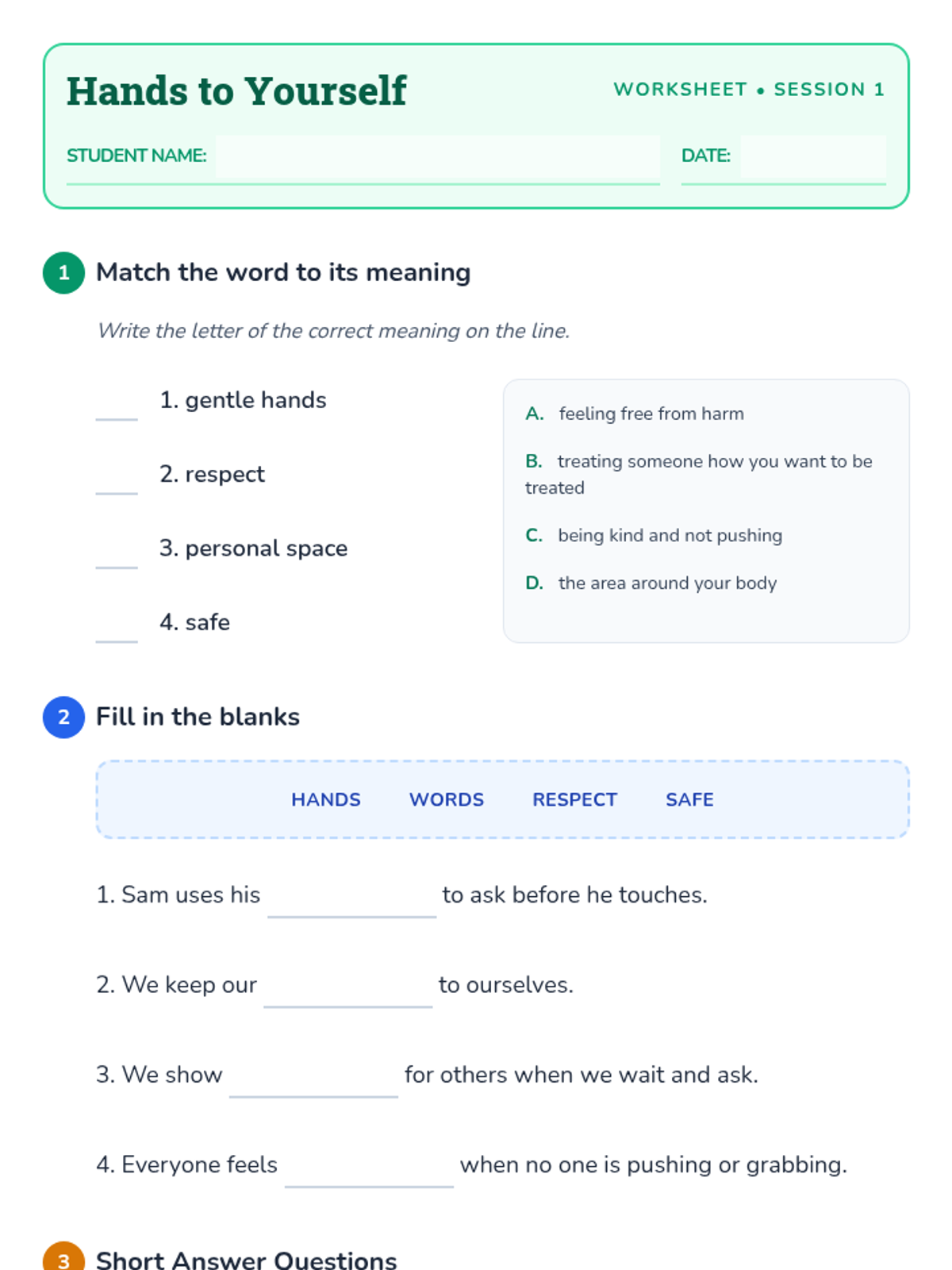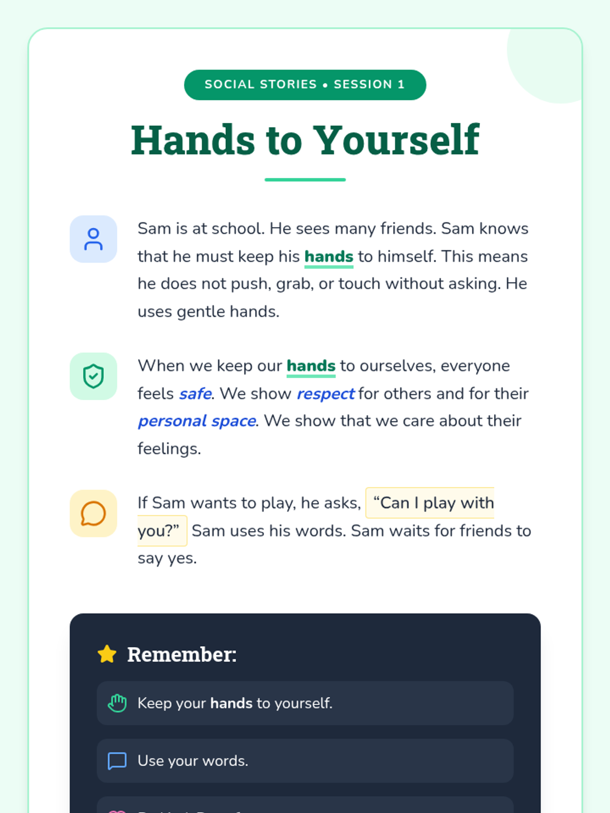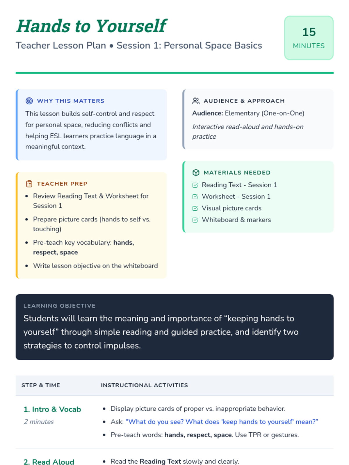 A two-session Tier 3 intervention sequence designed to help elementary students understand personal space and develop self-control. This sequence uses simple reading passages and interactive worksheets with ESL-friendly support to teach the importance of keeping hands to oneself.